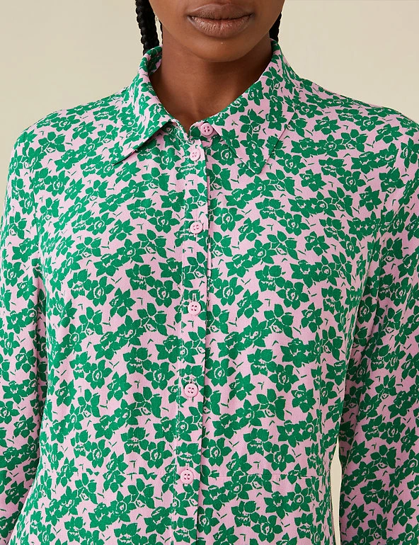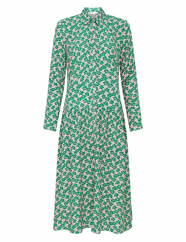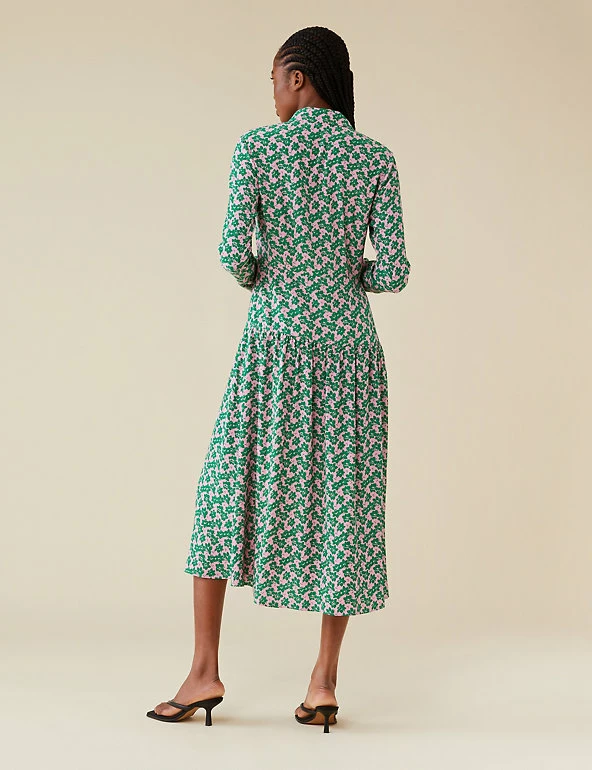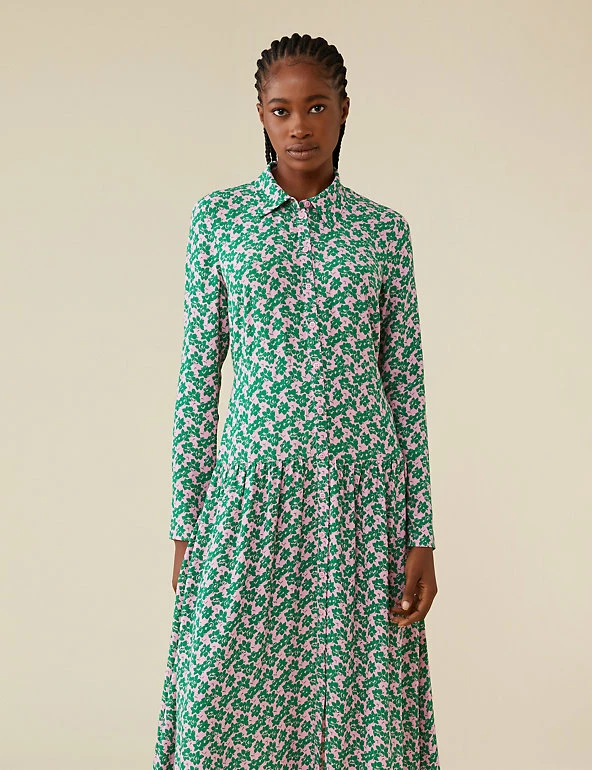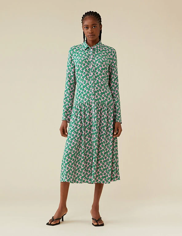 Bold florals make this Finery London dress a real head-turner. It comes in a regular fit, with long sleeves and a smart collar neckline. The button-through front gives way to a dropped waist and a flouncy midi-length skirt.