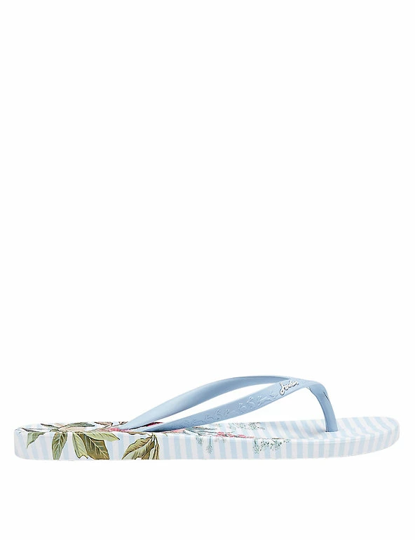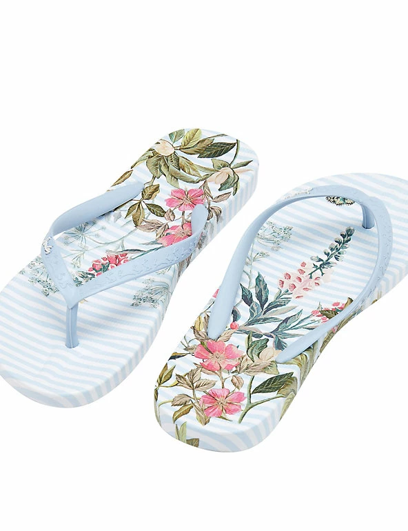 Give your warm weather staples a twist with these flip flops by Joules. The classic rubber pair have a toe-post design featuring Joules branding. Colourful florals, a butterfly motif and all-over stripes adorn these summer shoes.
