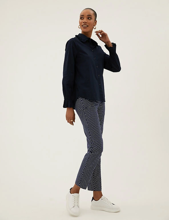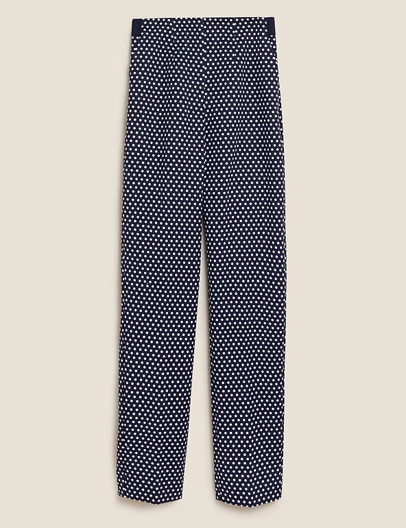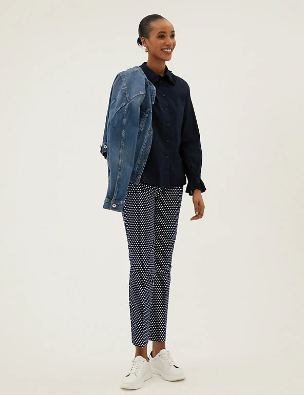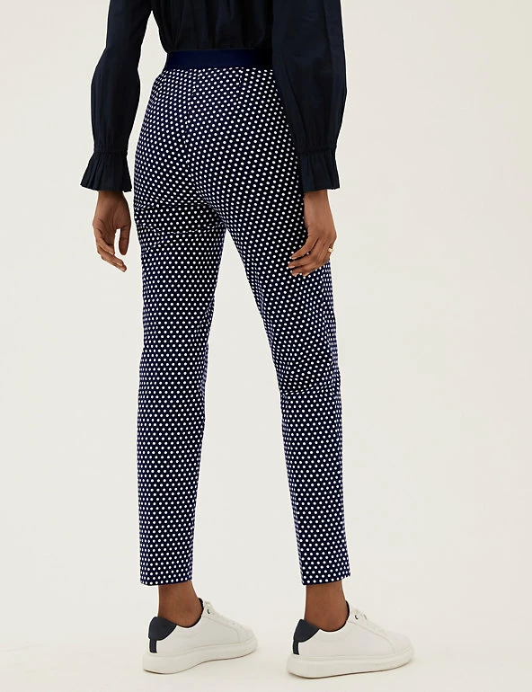 Spot our new favourite pair of cotton-rich trousers. They have a slim fit and are covered with polka dots for a playful effect. Darts front and back for a tailored finish, and side pockets to keep essentials close. Comfortable high waist with added stretch and ankle-grazer hems for a contemporary look. We only ever use responsibly sourced cotton for our clothes.