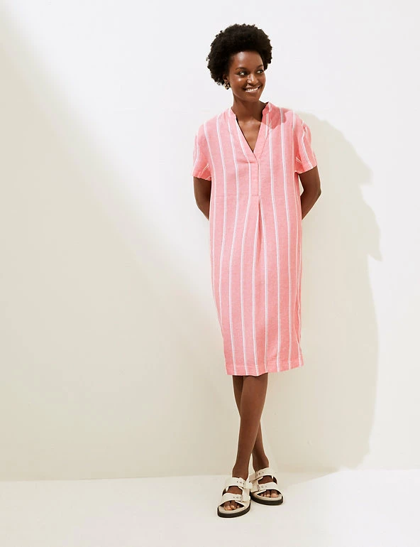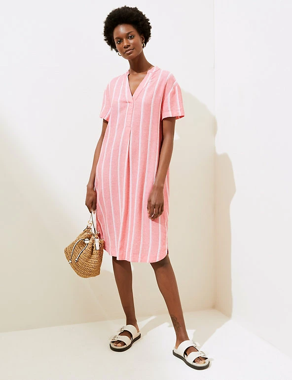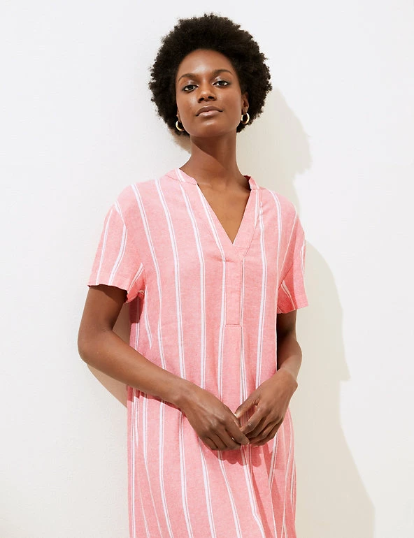Turn to this linen-rich striped shift dress for effortless off-duty style when the temperature rises. Regular fit with an elegant v-neckline and breezy short sleeves. Sits at an easy knee length. Made with sustainably sourced viscose.
