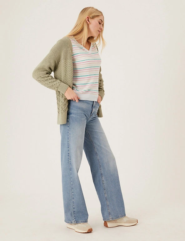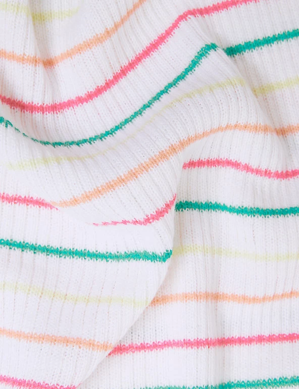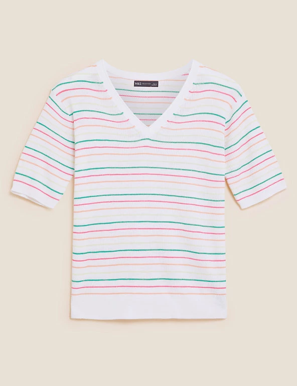 Bright stripes give a playful effect to this v-neck top, knitted with breathable linen. It’s cut in a relaxed fit, with ribbed fabric for a comfortable feel. We’ve styled it with a stretchy hem and short sleeves for a neat finish. M&S Collection: easy-to-wear wardrobe staples that combine classic and contemporary styles.