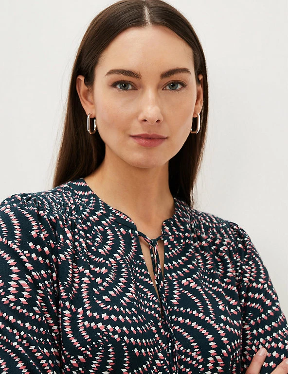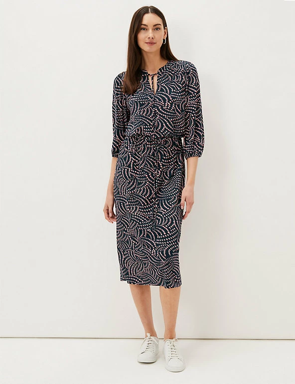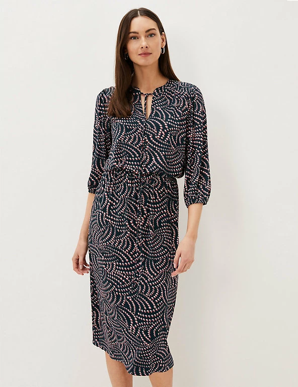 With its knee-length hemline and geometric print, this waisted dress from Phase Eight is easy to dress up or down. It’s cut in a comfortable regular fit, with three-quarter blouson sleeves that give an on-trend silhouette. The round keyhole neck has a dainty tie, and a drawstring fastening at the waist emphasises your figure.