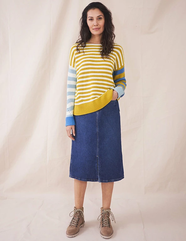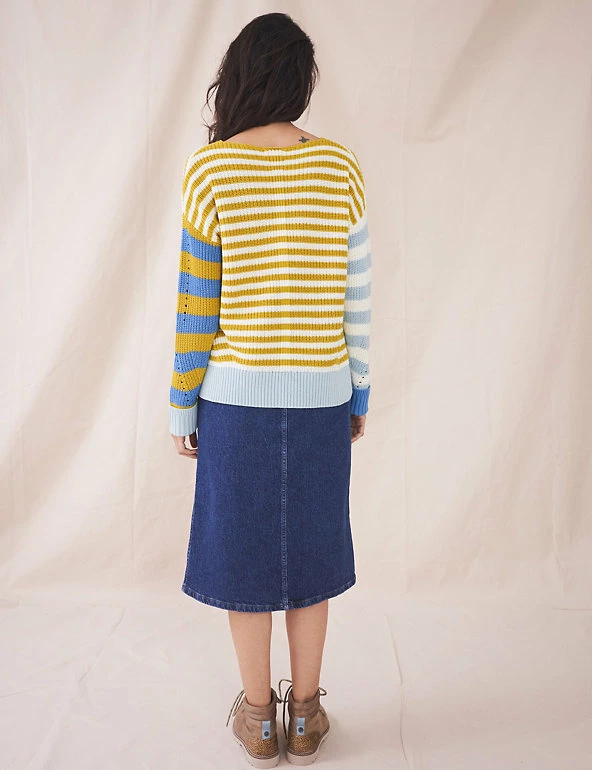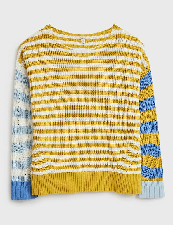 This pure cotton jumper by White Stuff combines colourful stripes for a bold effect. Cut to a regular fit, itβs designed with a crew neck and long, contrast striped sleeves. Ribbed trims give this piece a snug feel, and pointelle detailing adds a traditional touch.