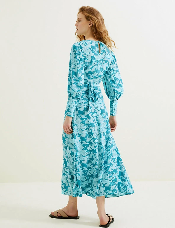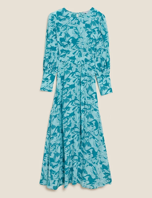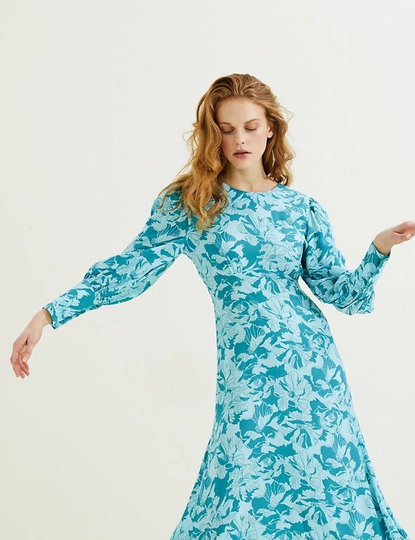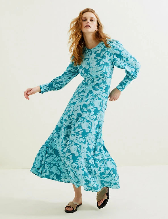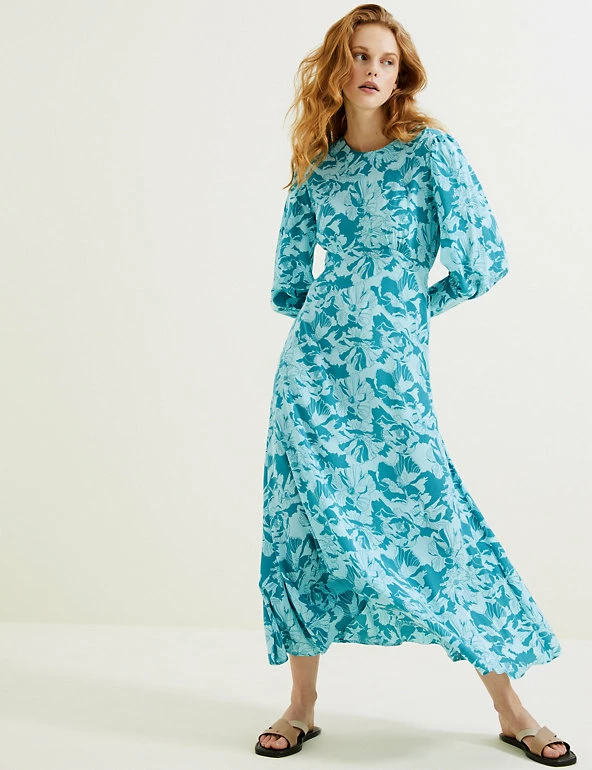 This Autograph cupro-rich tea dress with a versatile floral print is perfect for events year-round. It’s cut to a regular fit, with a flattering empire silhouette and long sleeves for extra coverage. The piece has an elegant maxi length, and it’s finished with a simple round neckline and a back button fastening.