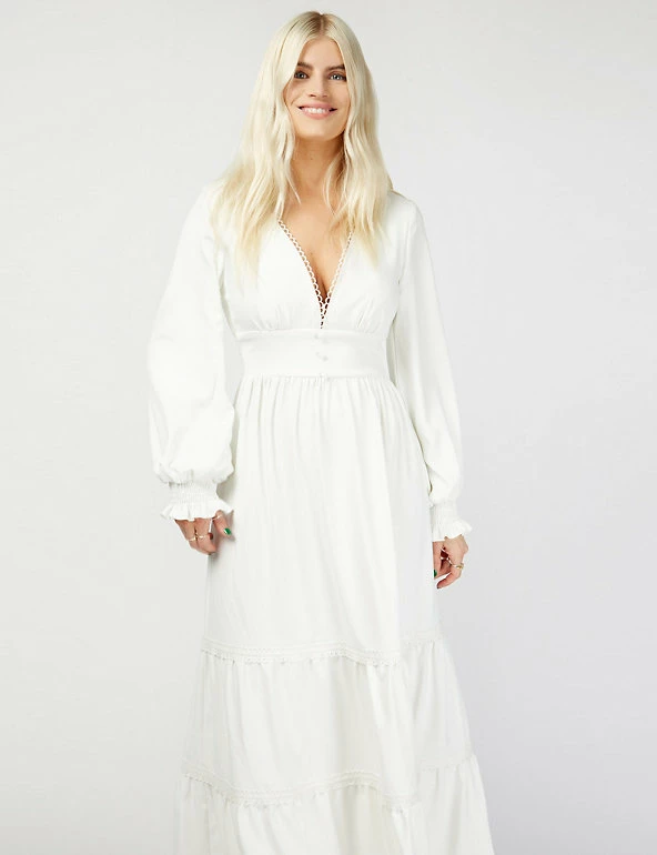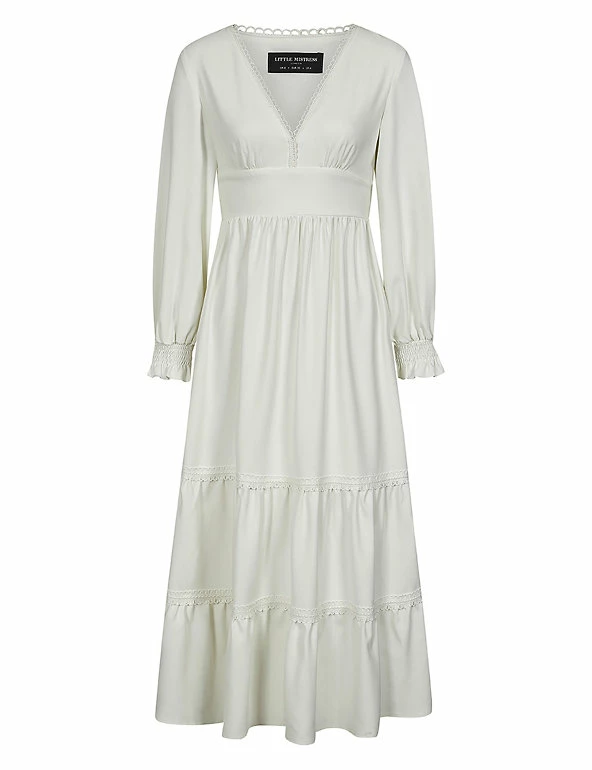 This floaty, feminine dress by Vogue Williams X Little Mistress is a perfect sunny day style. Designed to flatter, it comes in a regular fit with a v-neck and a panelled waistband which is shirred at the back. Elasticated cuffs add extra volume to the long sleeves and the midaxi skirt is tiered for extra movement. Crochet embroidery and covered buttons add the final touches.