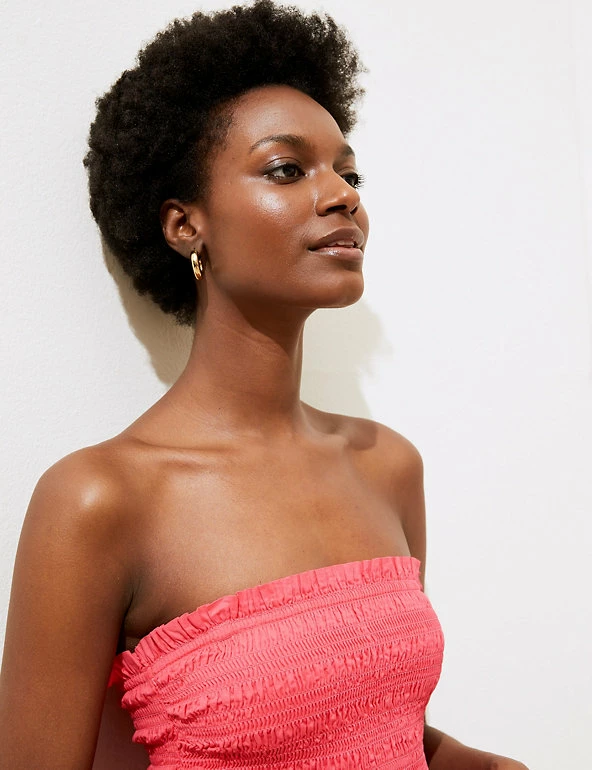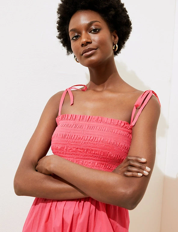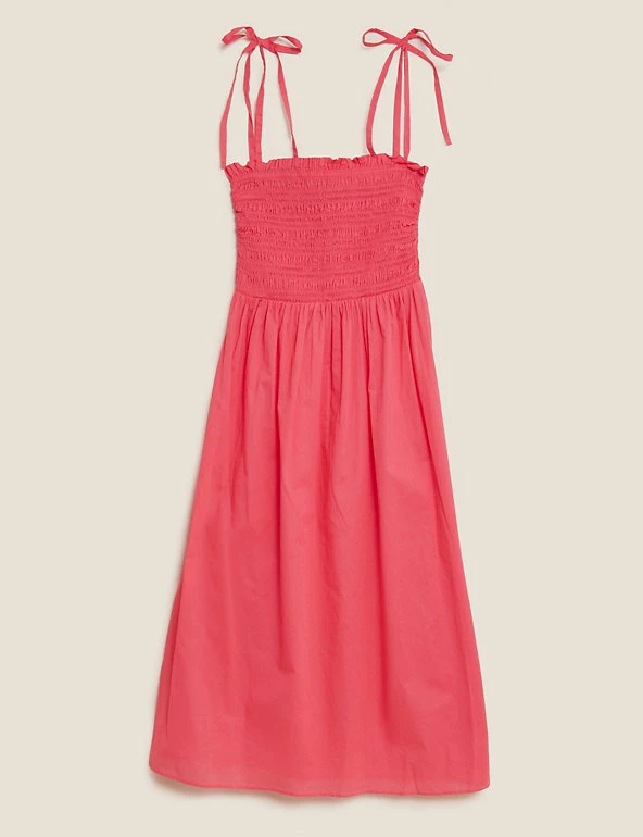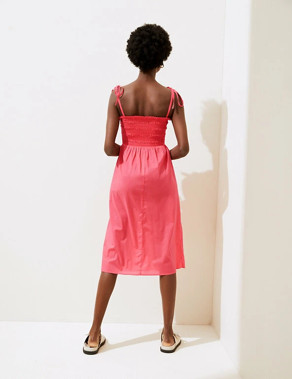 Pure cotton fabric gives this midi dress irresistible breathability. It has a regular fit with a shirred bodice for flattering shaping and self-tie straps for an elegant effect. A square neck gives a contemporary finish.