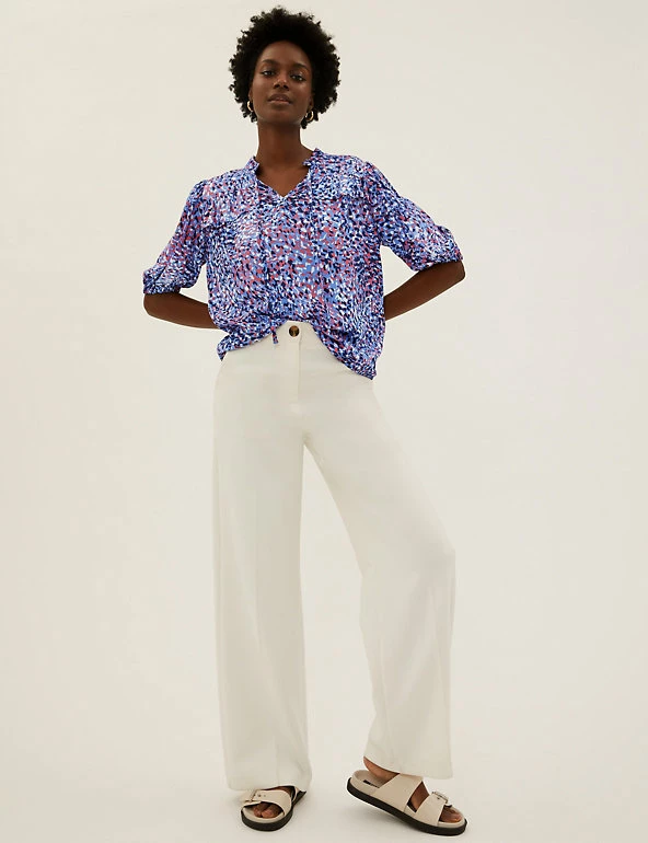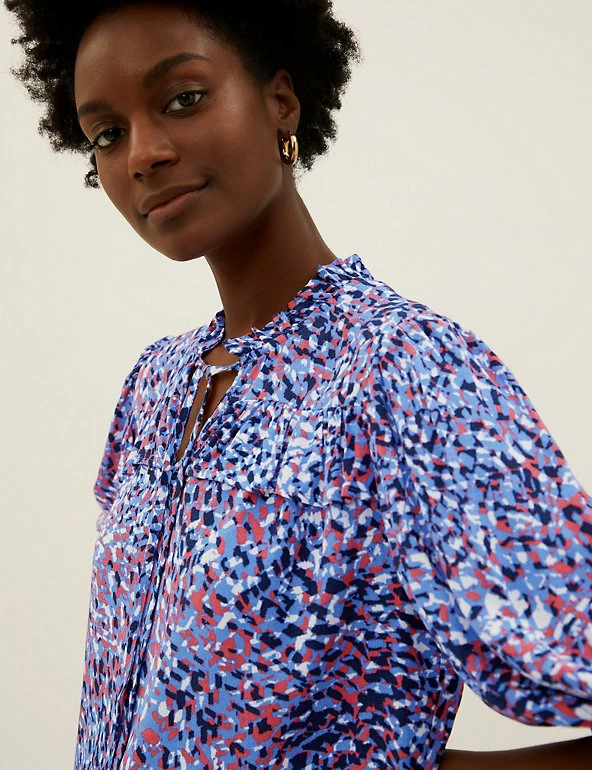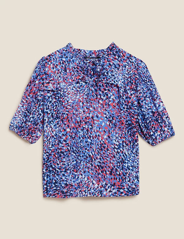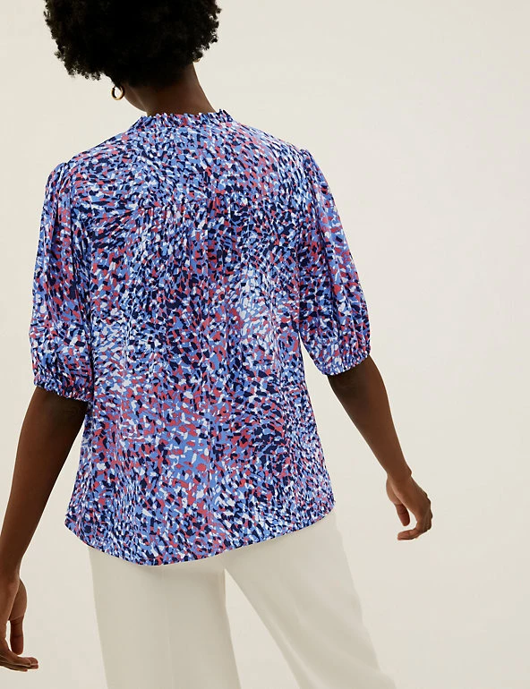 A striking print gives this popover blouse a stand-out look. It has a regular fit with a dainty frilled tie neck. Short sleeves give a breezy finish.