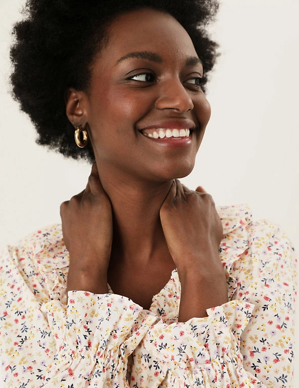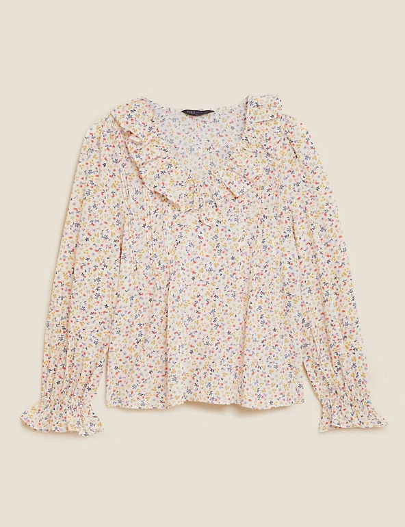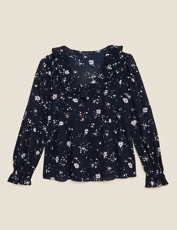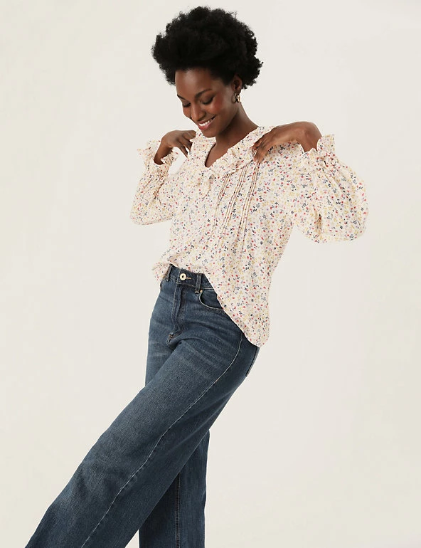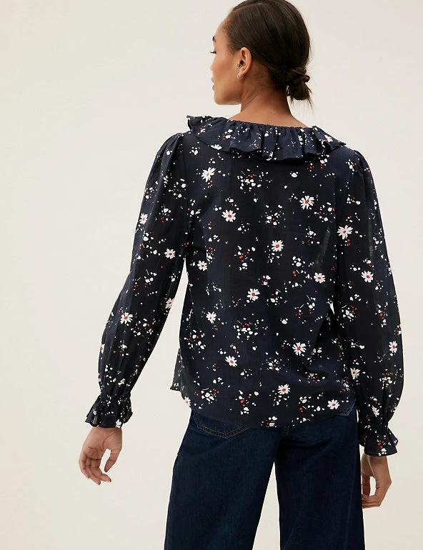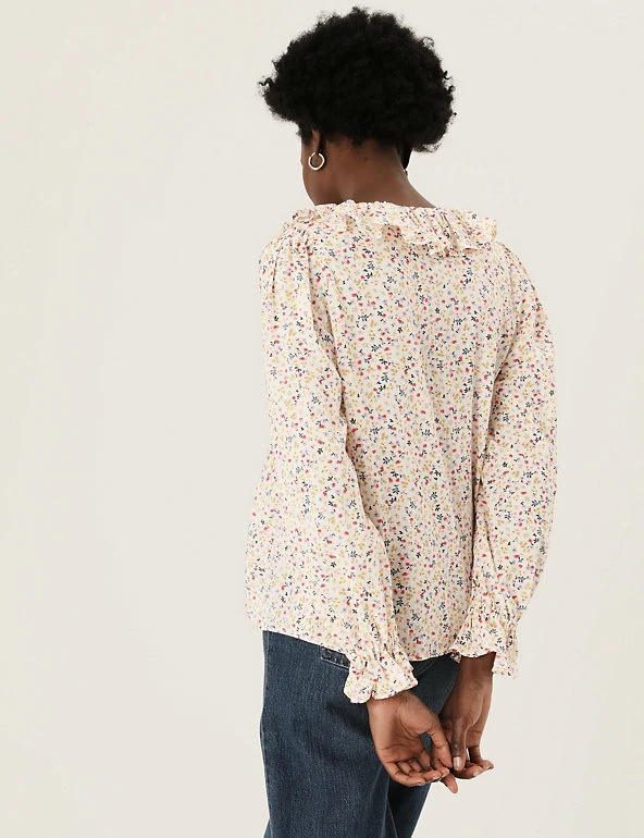 Dainty flowers give this pure cotton blouse an elegant finish. Regular fit, with a popover shape for easy wear. Ruffle at the v-neck and long frilled sleeves for a feminine finish.