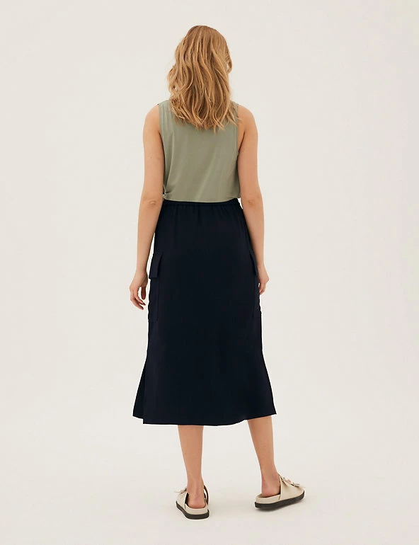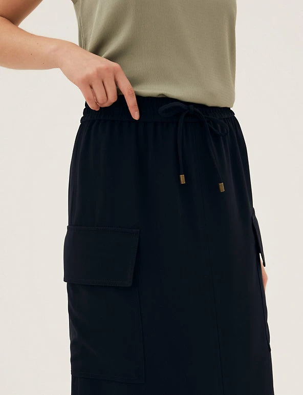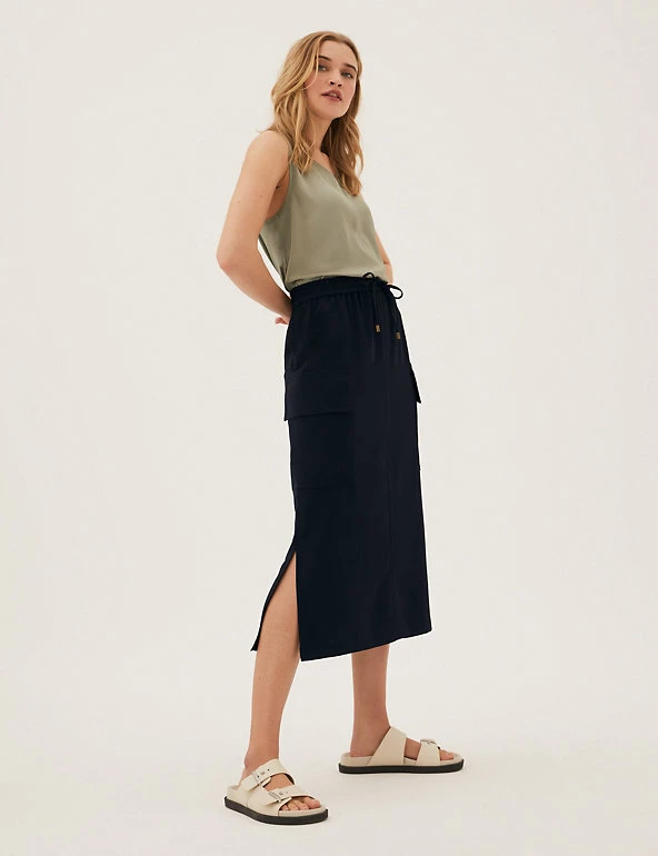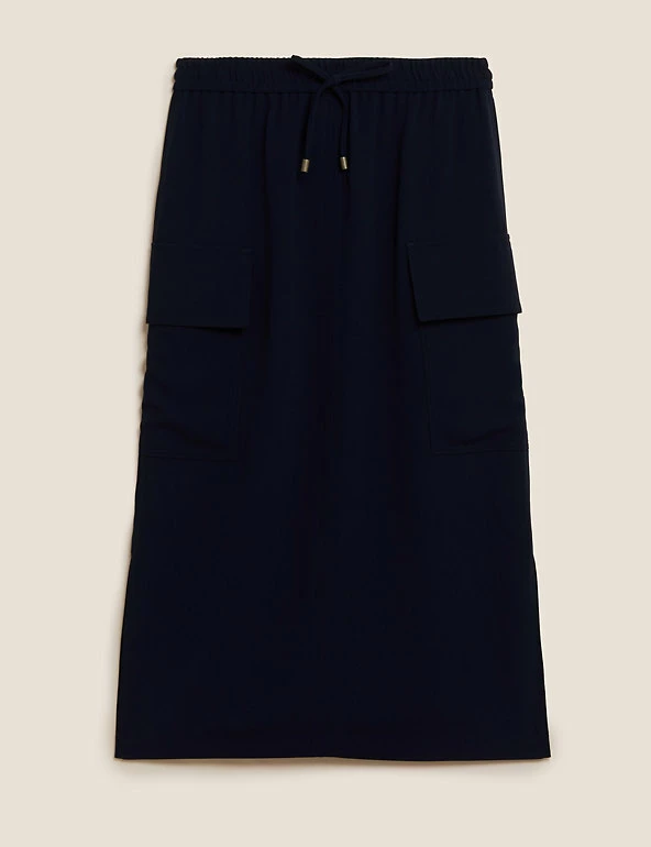 Be ready for whatever the day holds in this midi utility skirt. The flattering shape features side splits for easy movement and deep pockets that are ideal for storing essentials. A metal-tipped drawstring at the elasticated waist offers a comfortable fit.