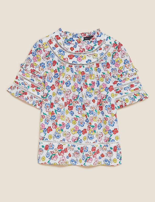 Dainty details and a floral print give this pure cotton top a playful finish. Regular fit, with short sleeves and fun frills at the high neck for a feminine look. You’ll find delicate ladder inserts around the cuffs, hem and neckline for an added flourish.