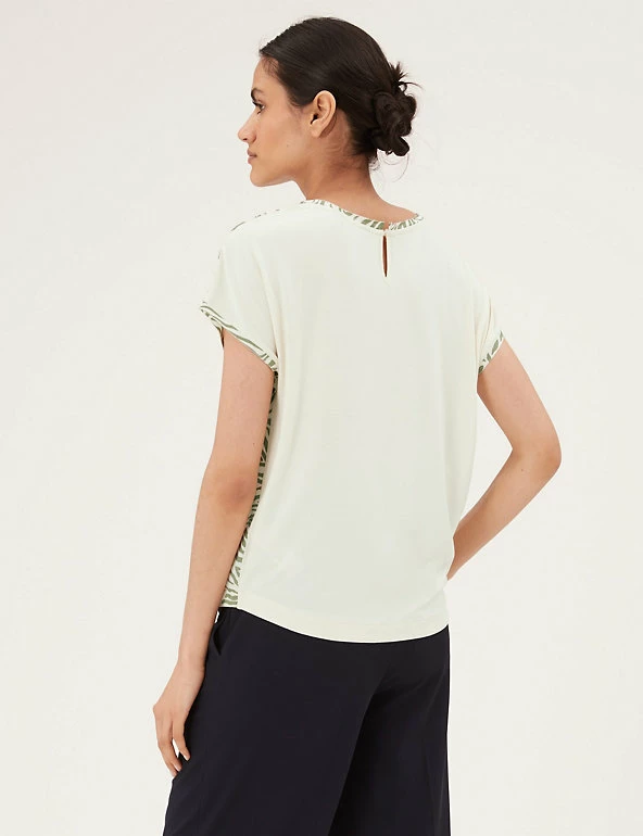 Complete your smart-casual look in this animal print top. Relaxed fit with short sleeves for a laid-back effect. The striking slash neck is fastened with a button. Soft jersey fabric features on the back. Made with sustainably sourced viscose.