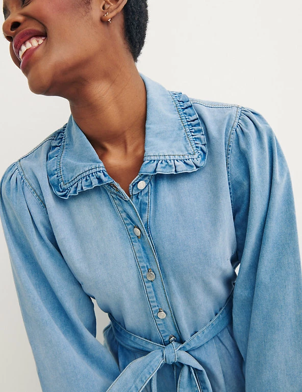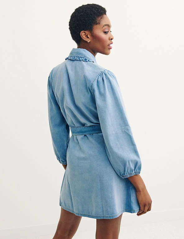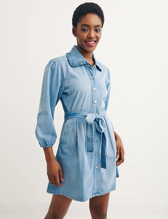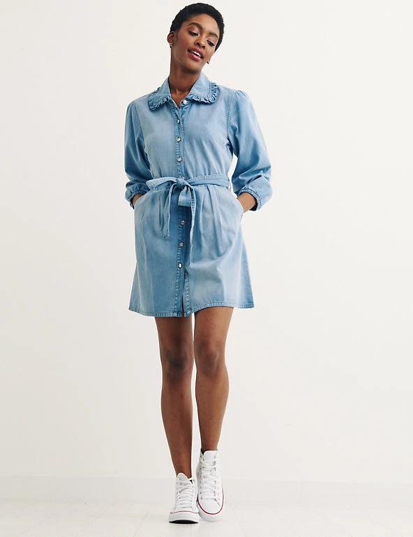 Reach for this denim mini dress from Nobody’s Child to impress on casual days. It’s designed in a comfy regular fit with a super flattering belted waist. This versatile, pure-cotton piece has a button-through closure and a frilled collar for extra playfulness. The long sleeves have gentle volume for a feminine touch and end in elasticated cuffs. Made with organic cotton.