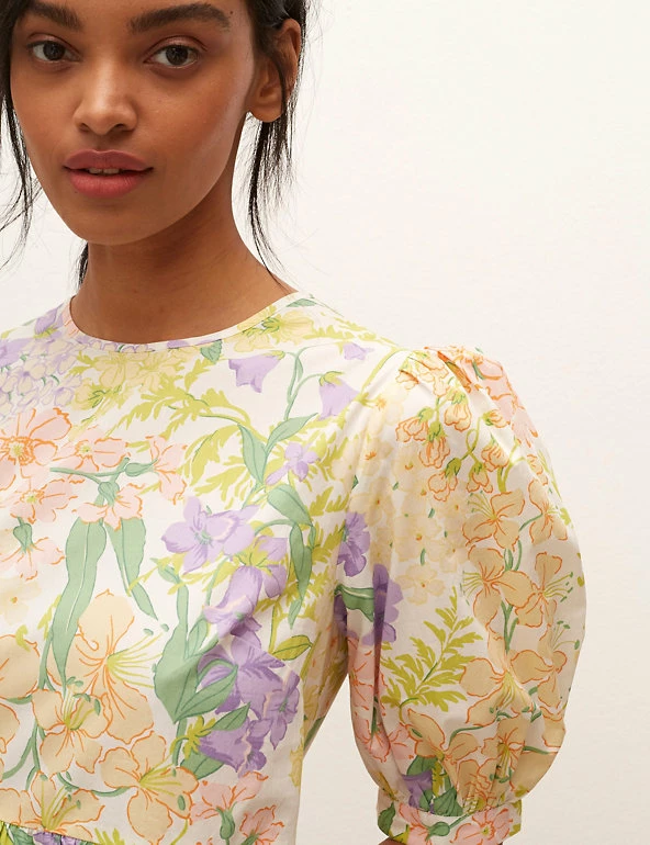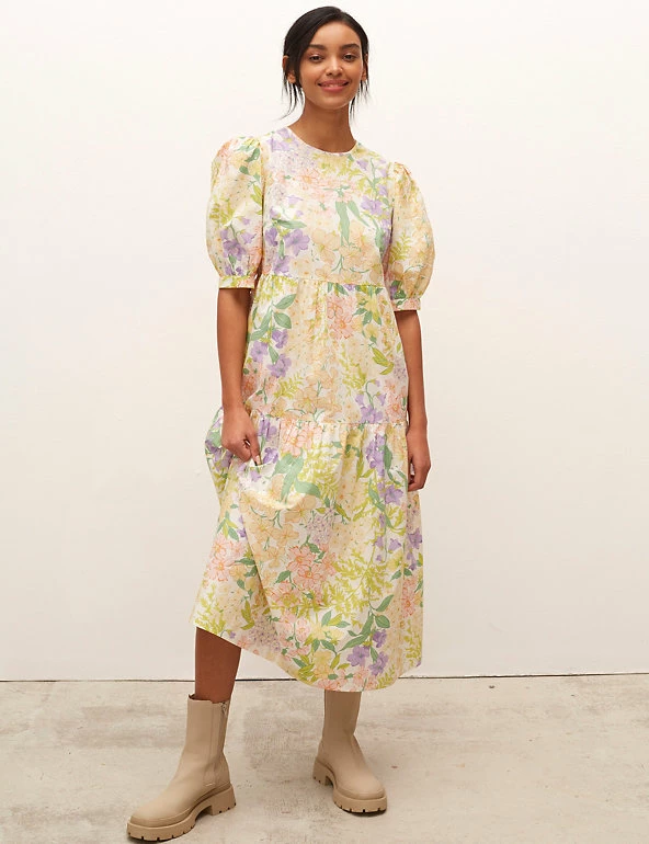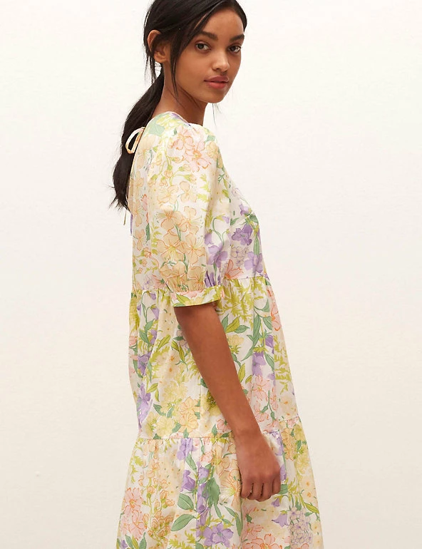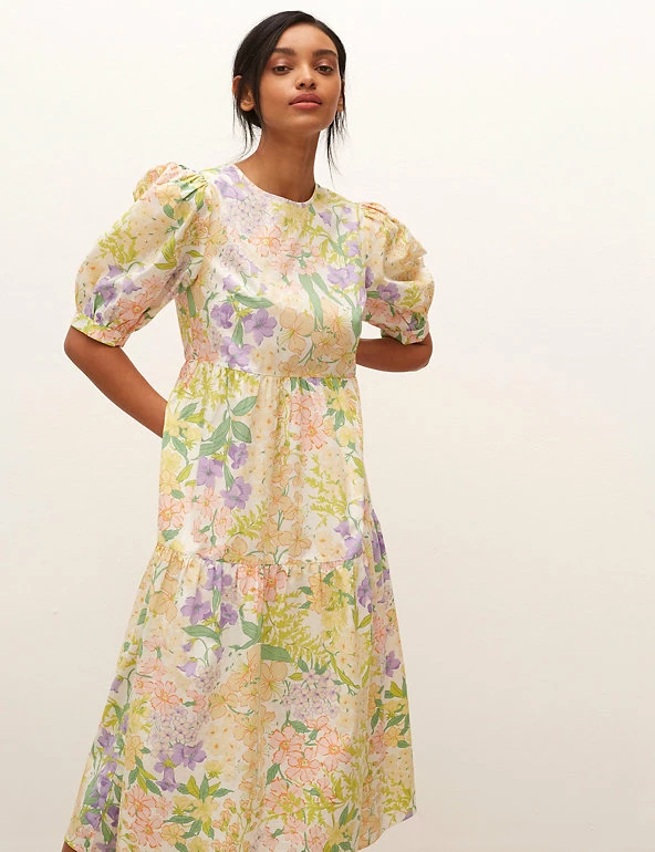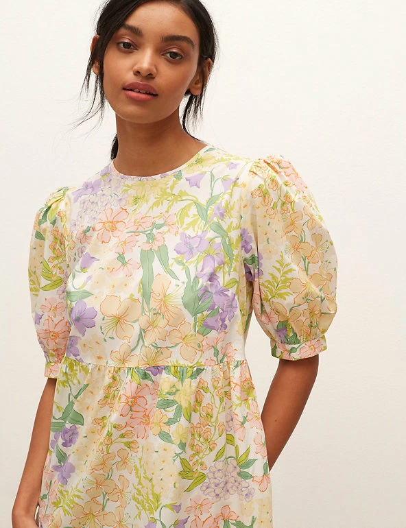Give your look some floral charm with this pure cotton smock dress by Nobody’s Child. It’s cut in a comfy relaxed fit, with a simple round neckline that has a skinny tie fastening at the back. The short puff sleeves have classic appeal. The tiered skirt brings subtle shaping to this piece, which sits at a flattering midi length.