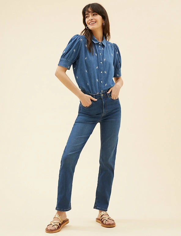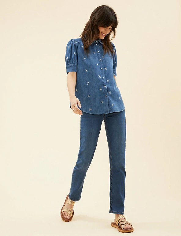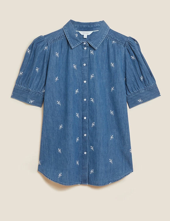 This pure cotton denim blouse from our Per Una range is full of feminine charm. Made to a regular fit, it features short sleeves with puff detailing for a touch of volume. A simple popper fastening and a collared neck create a classic look, while floral embroidery adds a pretty finish. We only ever use responsibly sourced cotton for our clothes.