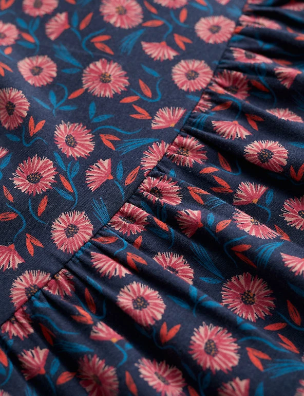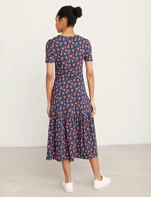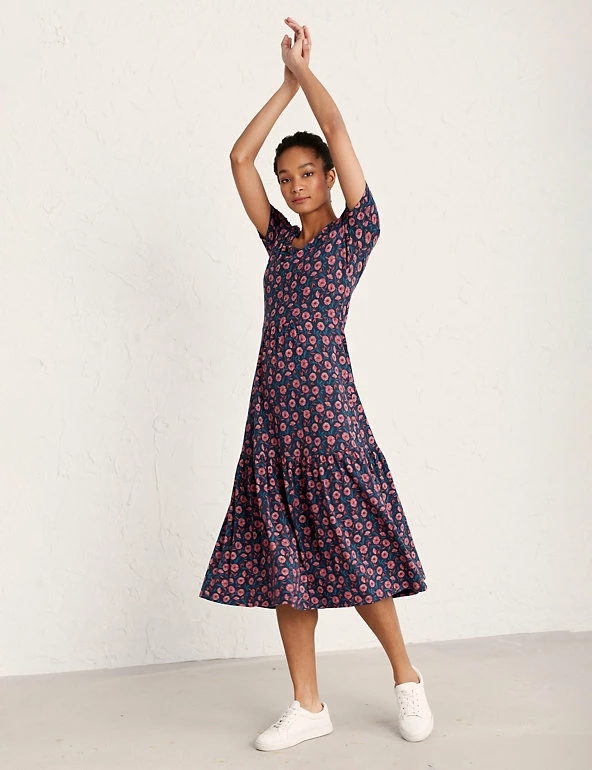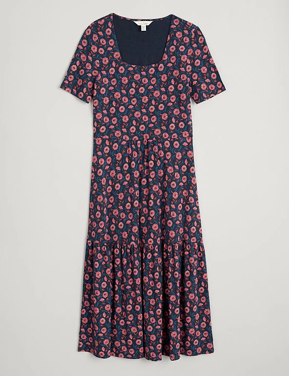 Show up to casual events in this eye-catching jersey dress by Seasalt Cornwall. Adorned with a coastal-inspired floral print, this regular-fit piece flatters your figure with its waisted midi-length cut and contemporary square neckline. This short-sleeved dress is finished with playful tiered detailing on the skirt.