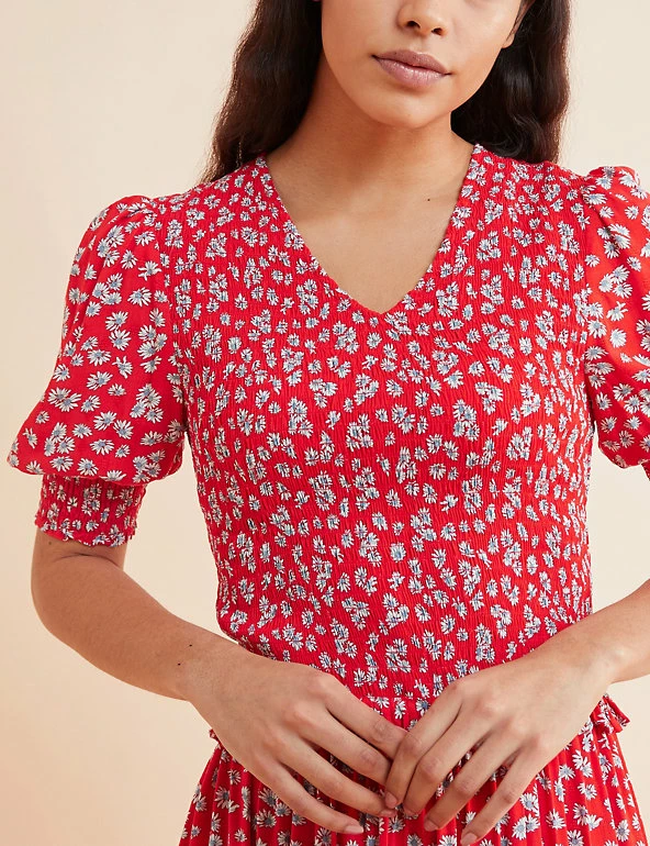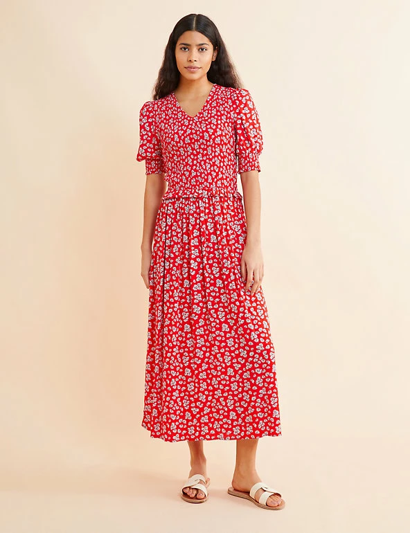 For easy summer style, look no further than this swing dress by Albaray. This regular-fit midi features a flattering v-neck and a shirred waist. The short puff sleeves are enhanced by elasticated cuffs, and the all-over floral print makes this piece a timeless choice. Made with sustainably sourced viscose.