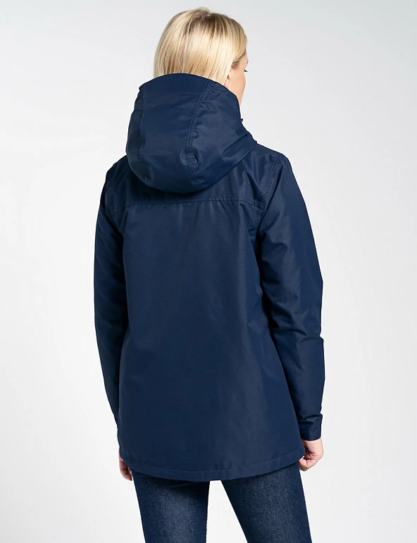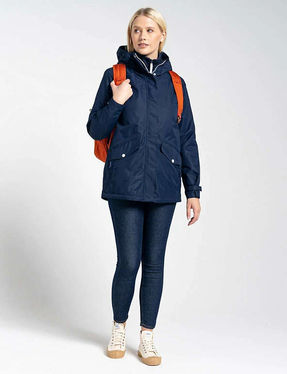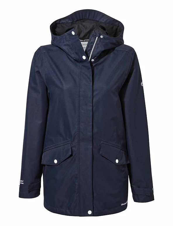 Be protected from the elements in this waterproof Craghoppers jacket. Its relaxed fit allows plenty of room for underlayers, and an adjustable hem keeps out chilly draughts. Individual pockets for a mobile phone, a standard O/S map and an audio device help you stay organised, and a zipped security pocket takes care of valuables. The brand’s Aquadry membrane combines a technical outer fabric with a durable coating for a water-repellent finish with excellent breathability. The zip fastening is tucked behind a storm flap for extra protection. Made with recycled polyester.