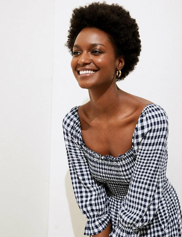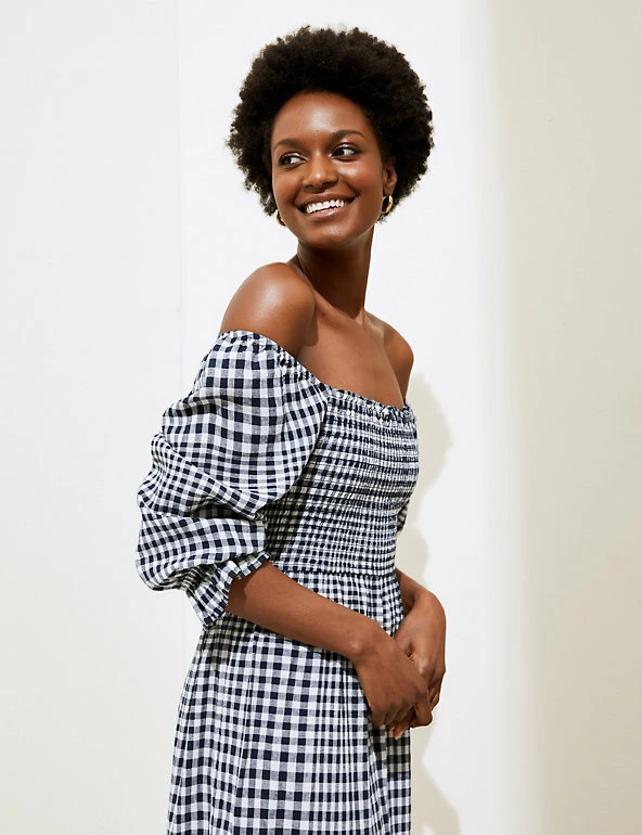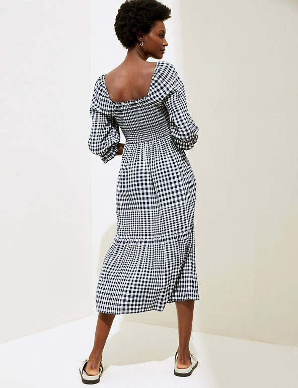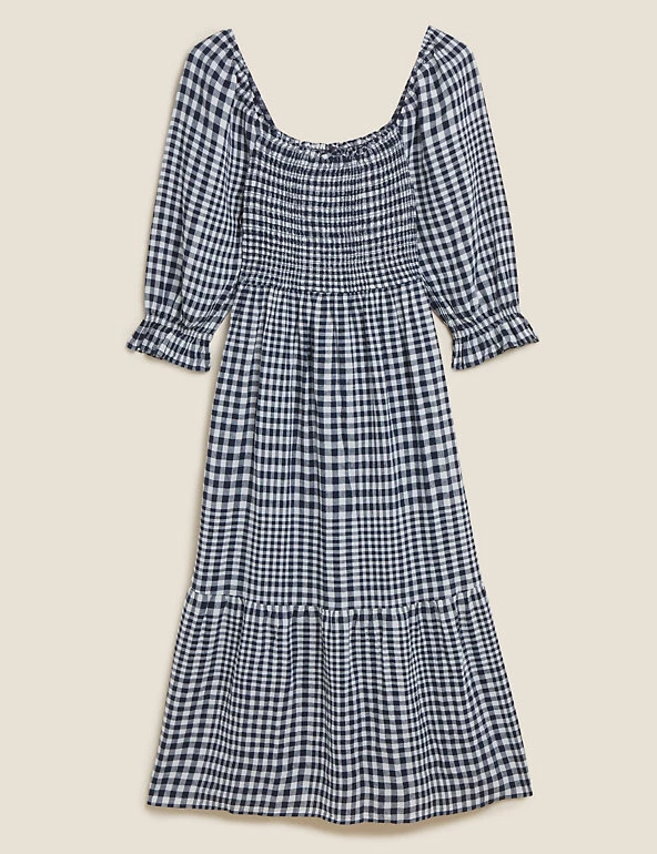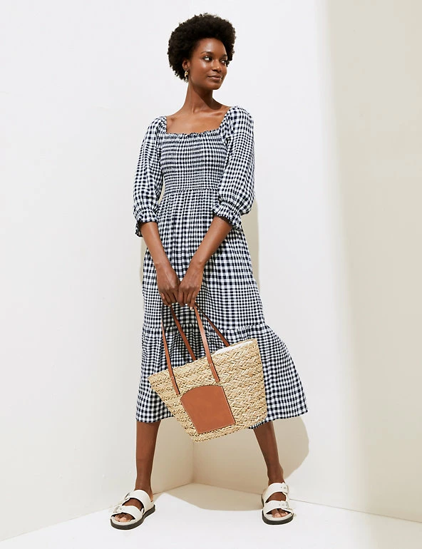 Crafted with breathable linen and featuring a timeless gingham print, this smock dress will become a staple in your spring-summer wardrobe. It’s cut to a regular fit, with a classic square neckline and a flattering shirred bodice. The short puff sleeves are adorned with ruffled cuffs. This tiered style falls to an on-trend midi length. Made with sustainably sourced viscose.