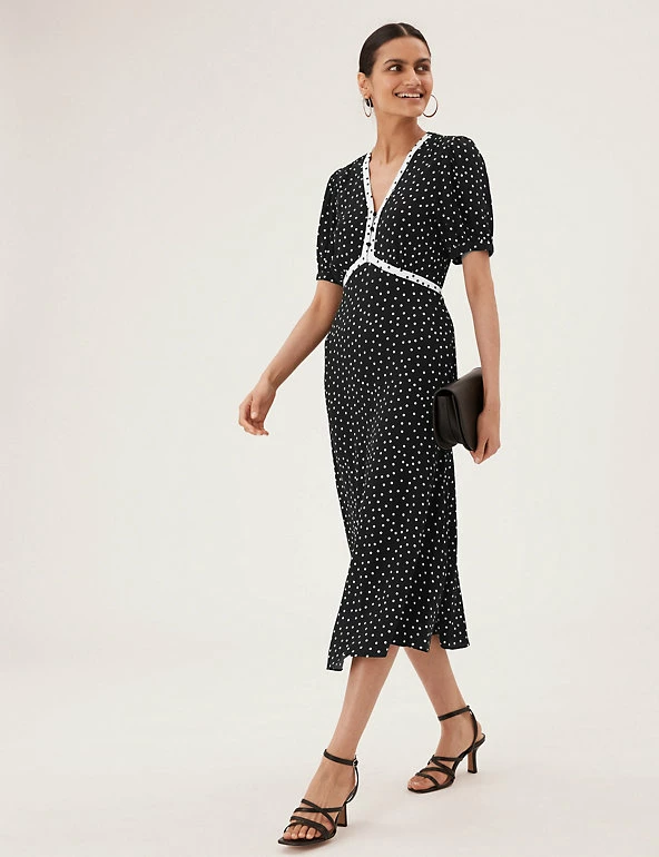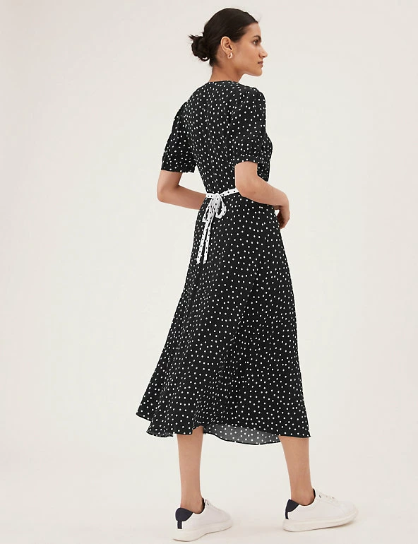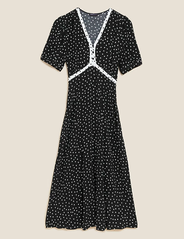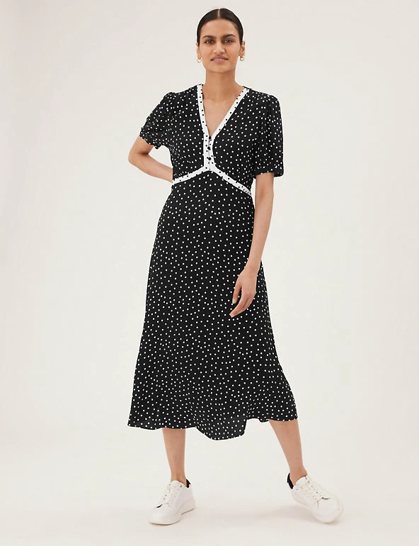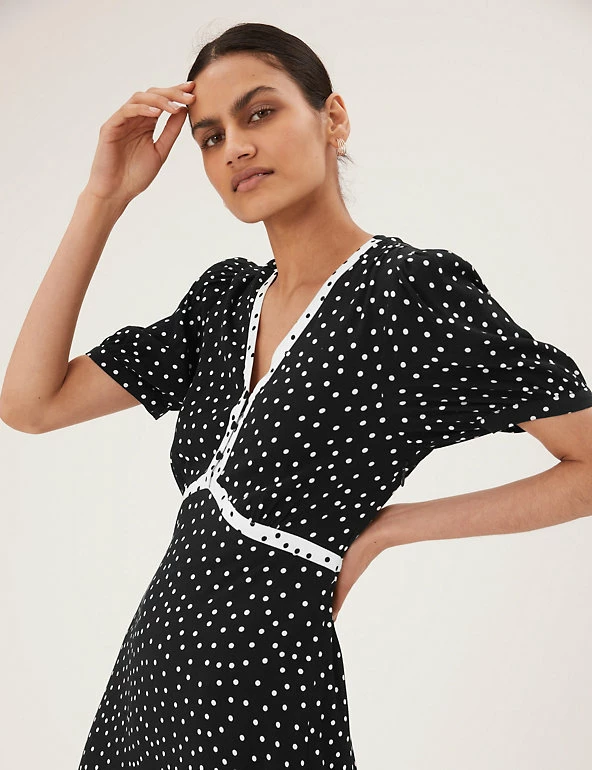 With its crisp polka dot design, this midi dress has a fresh and dainty feel. The tea style is cut in a comfortable regular fit, with a discreet side zip fastening. The feminine v-neckline and underbust seam are finished with a contrasting trim, while buttons on the front make for a practical addition. The short sleeves are gathered at the shoulder and cuffs for subtle volume. Made with sustainably sourced viscose.