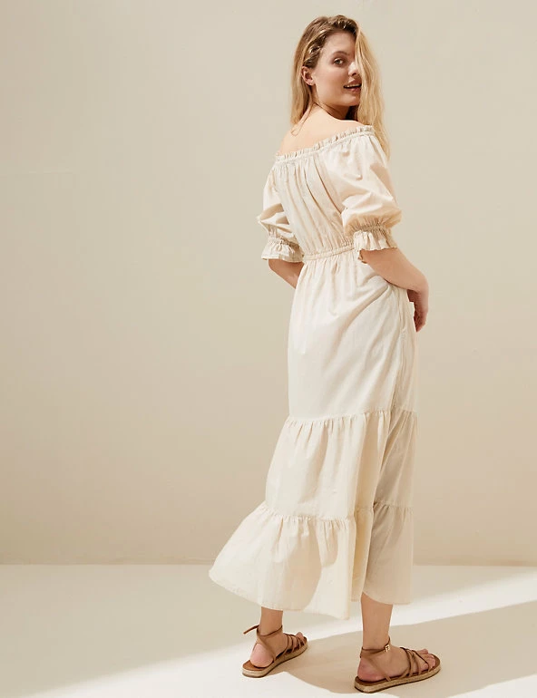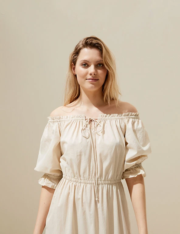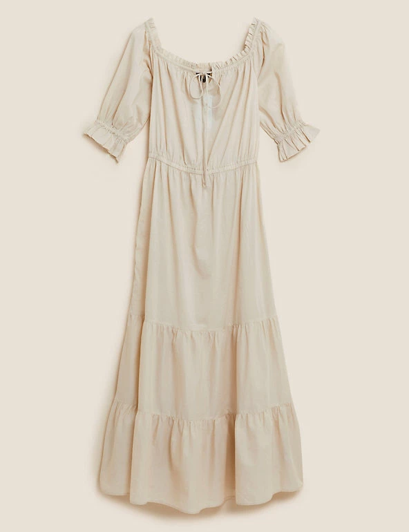 Pure cotton gives this Bardot beach dress an irresistibly breathable feel. It has a regular fit and tiers through the midi skirt for subtle shaping. We’ve stitched frills at the tie front neck and half-length sleeves for a dainty finish. We only ever use responsibly sourced cotton for our clothes.