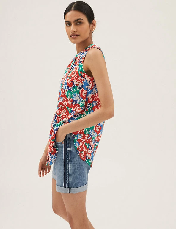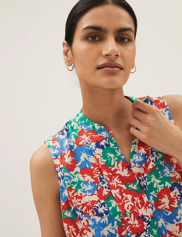 Go bold or go home in this longline popover blouse. Cut to a regular fit with a flattering v-neckline. Sleeveless design. Eye-catching floral print.