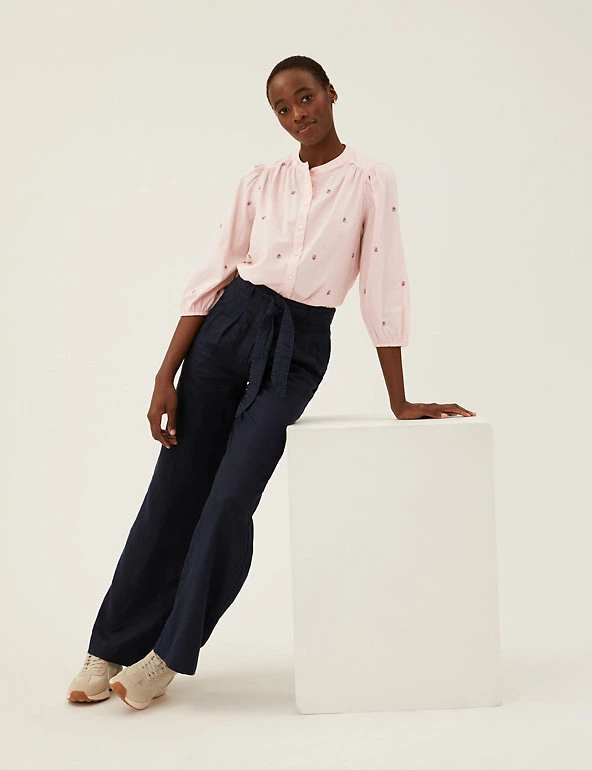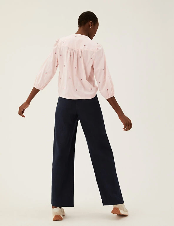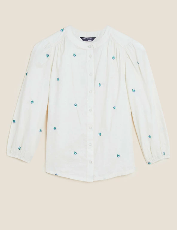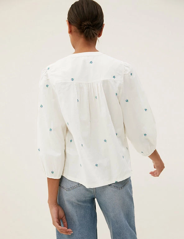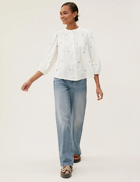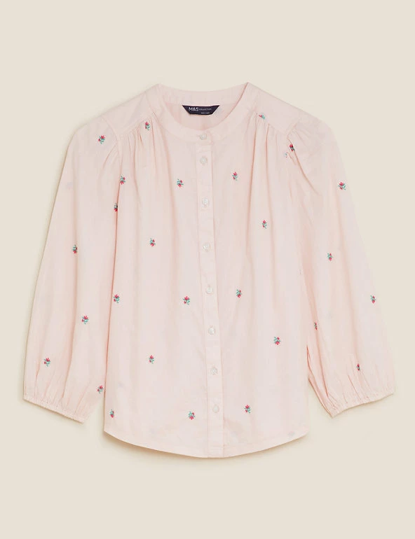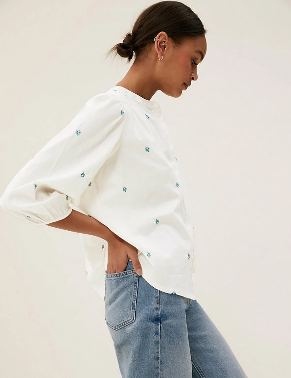 We’ve embroidered dainty flowers all over this pure cotton blouse for an intricate effect. Regular fit, with a button-through fastening. Three quarter-length sleeves and a high neck for a neat finish. We only ever use responsibly sourced cotton for our clothes.