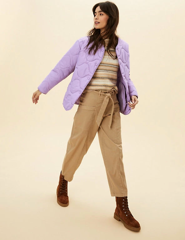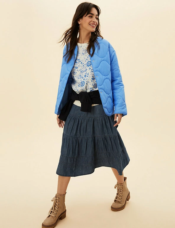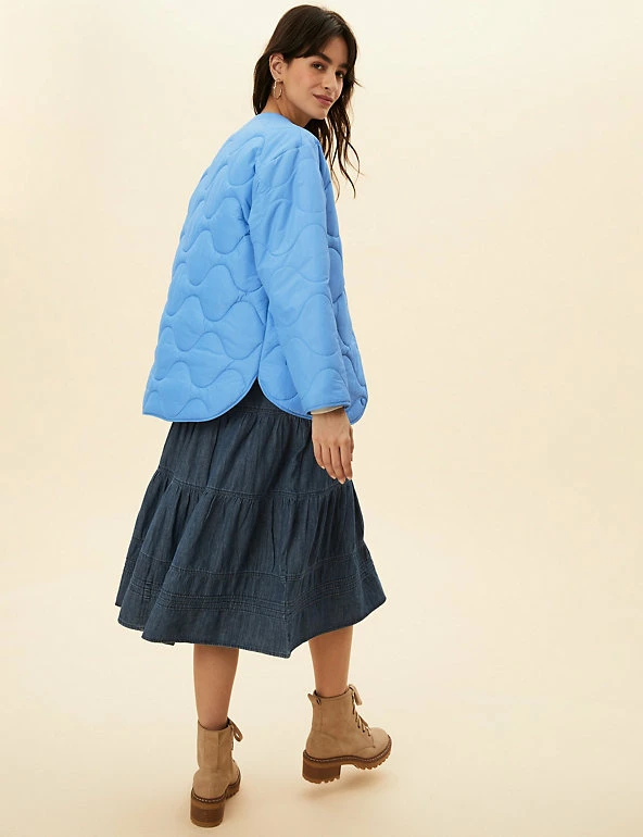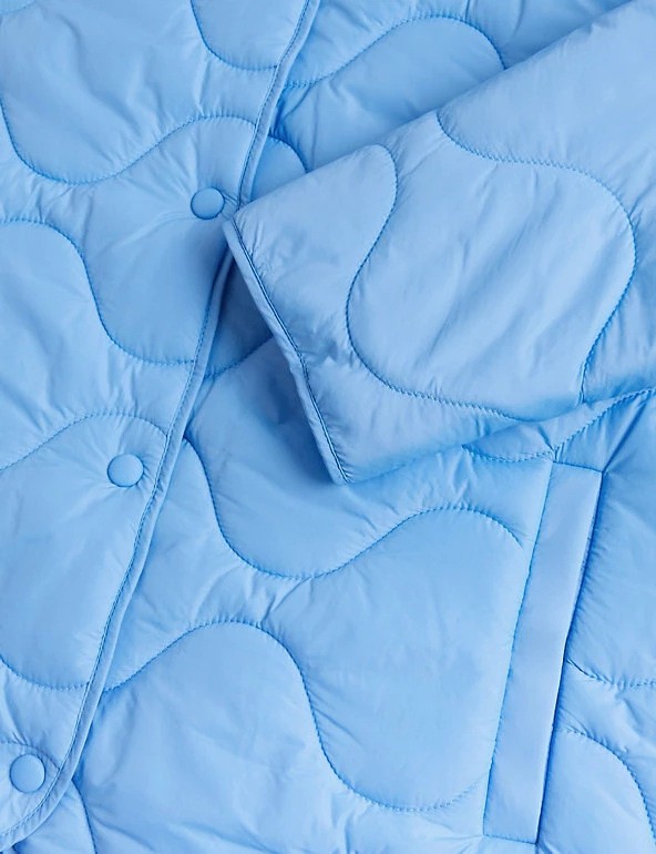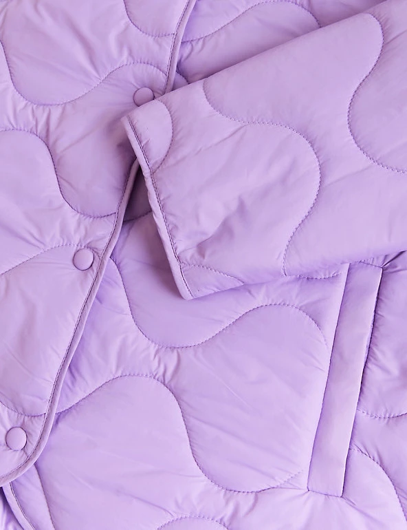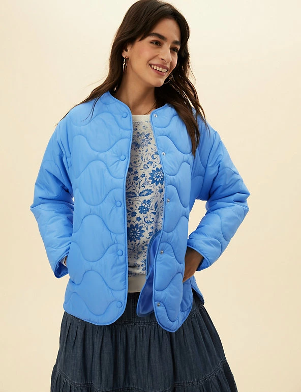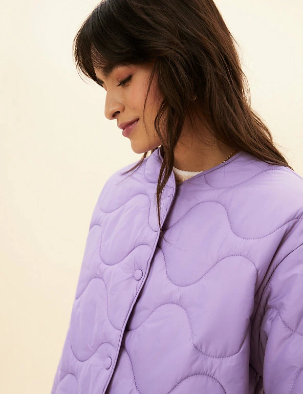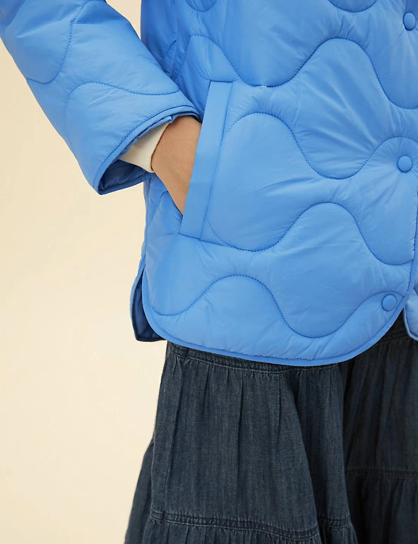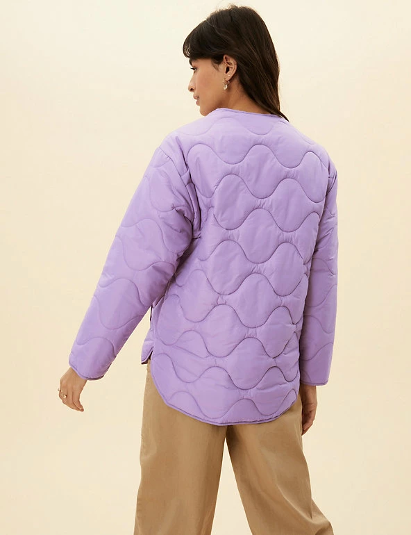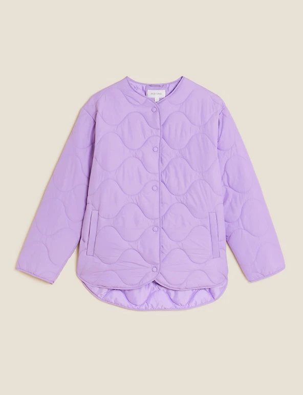 Opt for a contemporary look in this boxy puffer jacket from Per Una. It’s cut to a regular fit and padded to lock in warmth, yet it’s wonderfully lightweight. This collarless coatigan style has a laid-back shape that’s enhanced by onion quilting and a dipped hem at the back. Popper fastenings and two pockets at the front add neat finishing touches. Per Una: stylish designs crafted with carefully considered details and feminine flourishes.