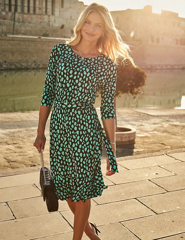 Create a bold day-to-night look with this printed dress from Sosandar. It’s cut to a regular fit and flows to a flattering midi length. A tie waist allows you to find the perfect shape, and it’s finished with a classic round neck and three-quarter length sleeves.