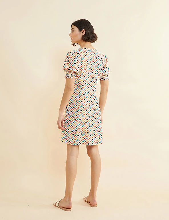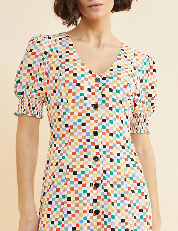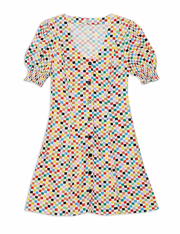 Bring a touch of fun to your wardrobe with this colourful checkerboard tea dress from Albaray. It’s cut in an easy regular fit, with a feminine v-neckline and button fastenings that finish at the mini-length hem. The short puff sleeves are shirred at the cuffs to give extra fullness. Made with sustainably sourced viscose.