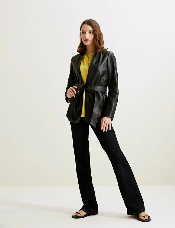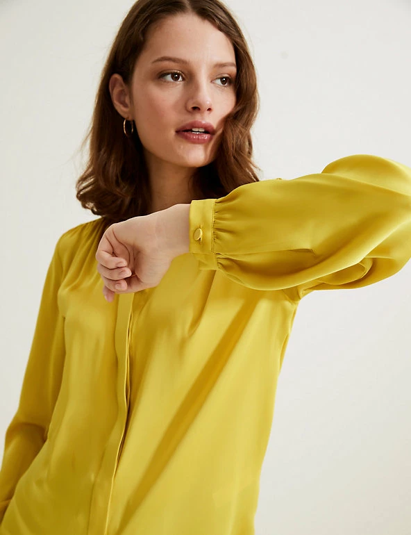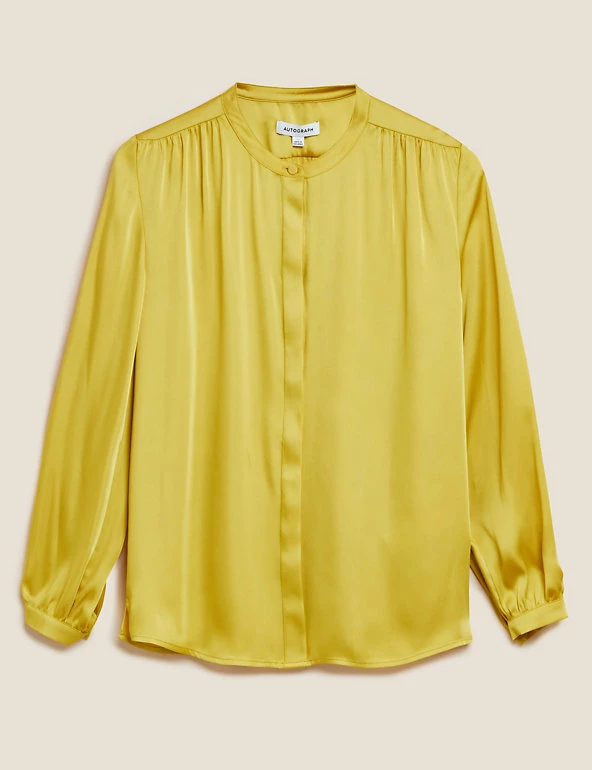 This understated Autograph blouse is crafted from silky smooth satin. It’s cut to an effortless regular fit and has a collarless high neck for a modern feel. The button-through fastening is hidden by the front placket for a sleek finish. Made with recycled polyester.