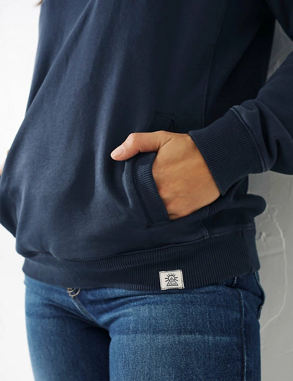 This cotton-rich sweatshirt from FatFace keeps you snug in effortlessly casual style. It’s made in a comfortable regular fit, with a high funnel neckline and a half-zip fastening so you can adjust your warmth levels. Vertical pockets at the waist keep your valuables safe, while ribbing at the cuffs and waistband shuts out draughts. An oversized round zip-pull adds a fun finishing touch.