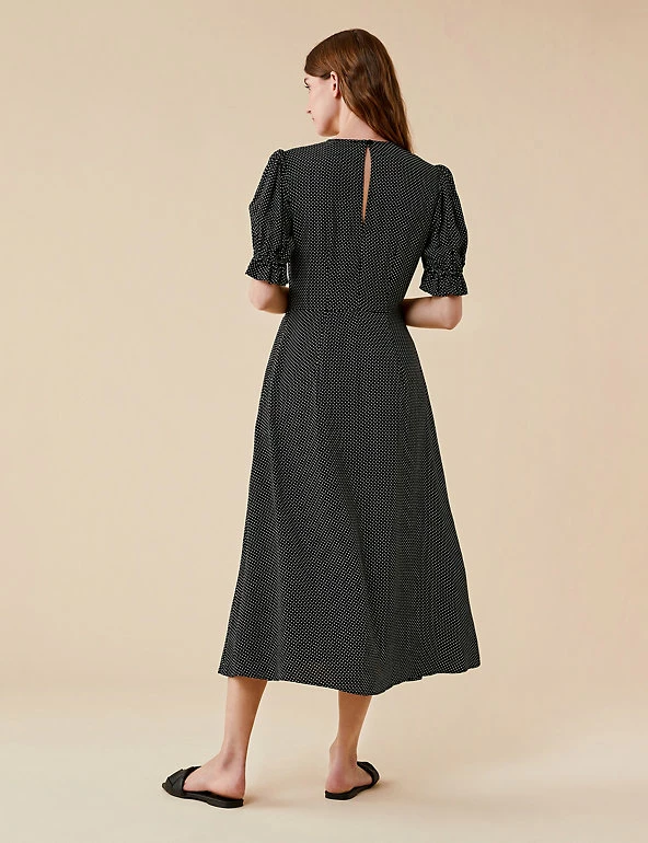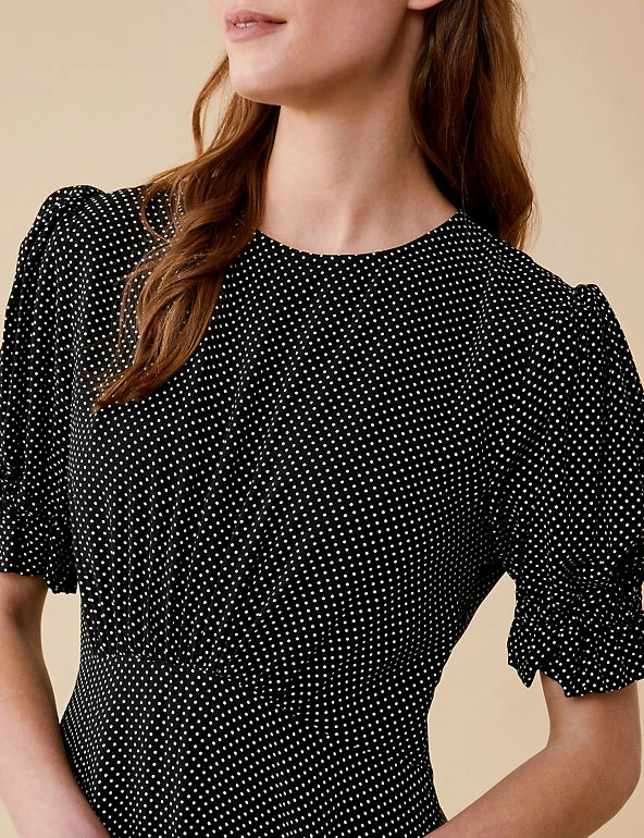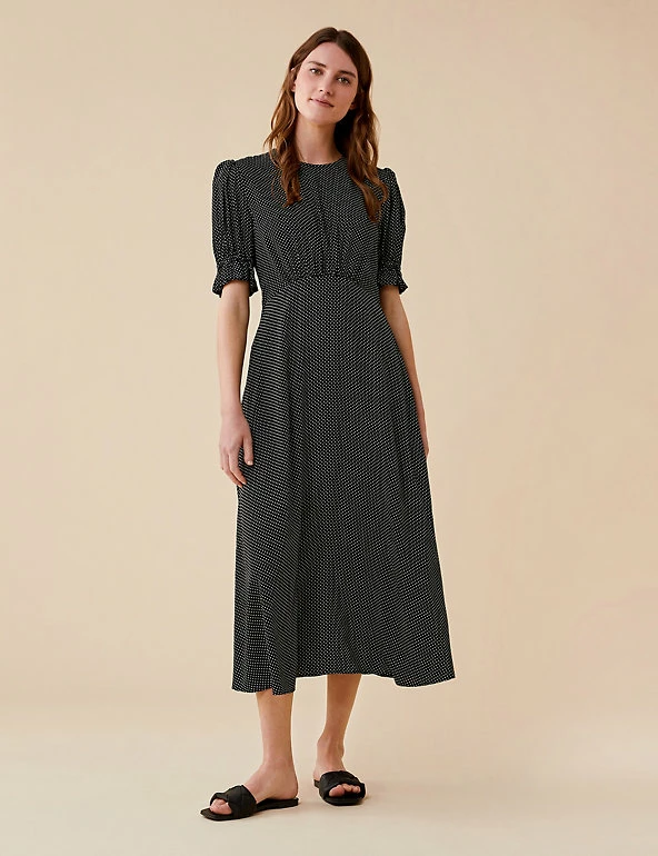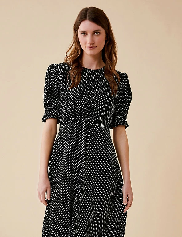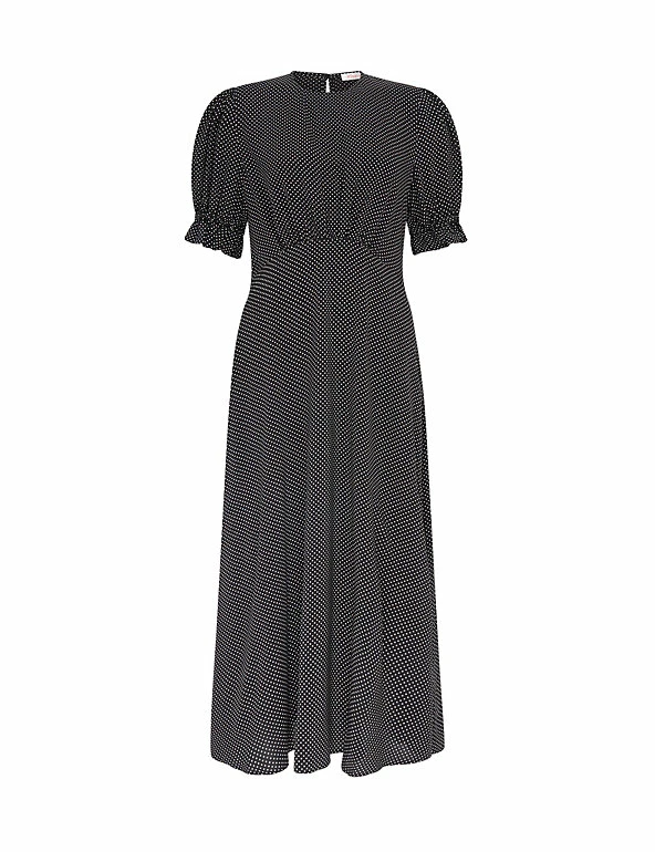 A polka dot print and elegant silhouette give this Finery London dress an air of classic refinement. It’s cut in a waist-skimming regular fit, with a drapey skirt. Its puff sleeves are elasticated for added shape.