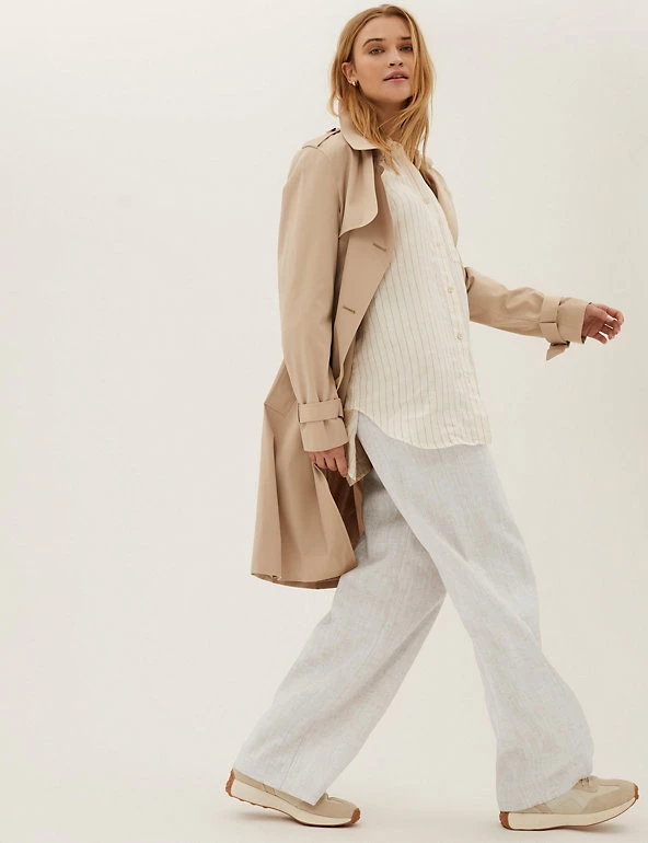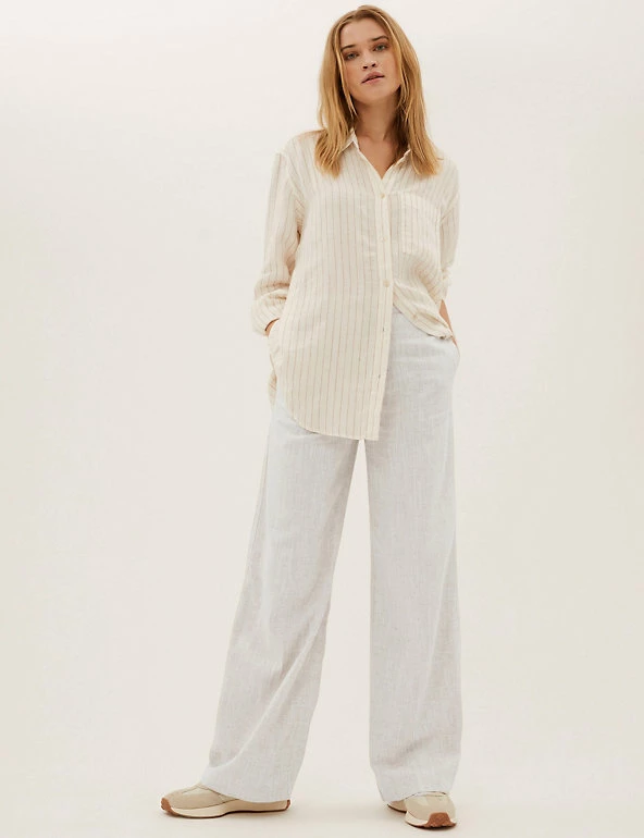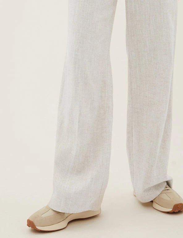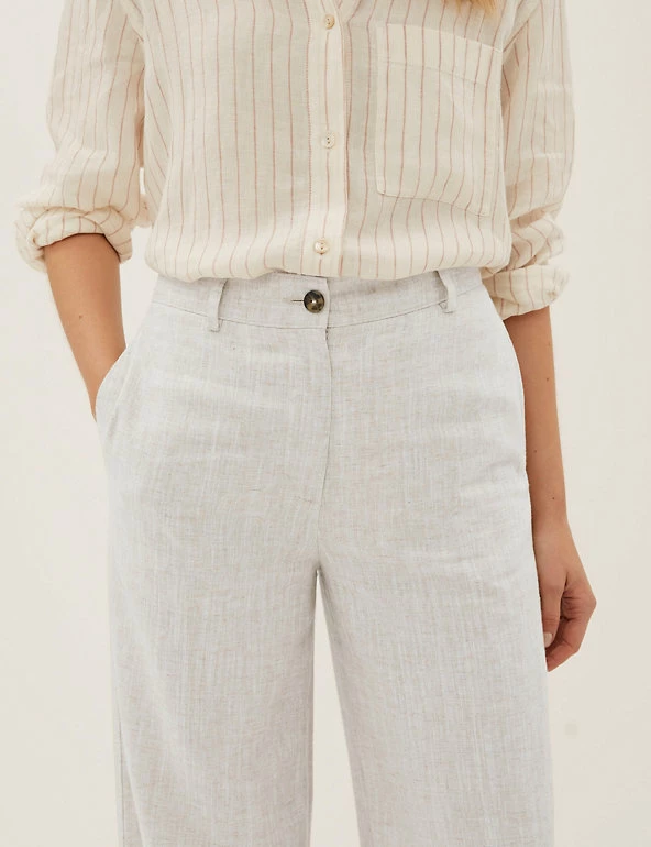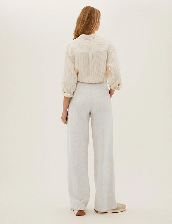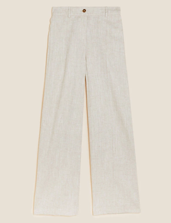 Stay smart in these breathable linen-blend trousers. They’re designed with breezy wide legs and a statement high waist. Back darts offer subtle shaping while the button and zip fastening provides a secure fit. Side pockets give a practical finish.