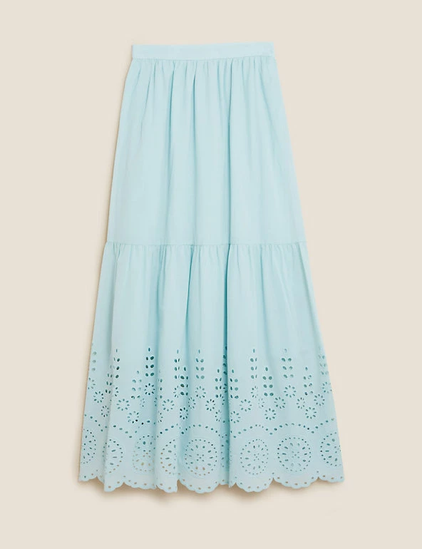 Swish into summer with this pure cotton midi skirt. It has a regular cut and a single tier for a playful silhouette. Intricate broderie detailing stretches up from the hem to offer a dash of detail. An elasticated high waist creates a comfortable fit. We only ever use responsibly sourced cotton for our clothes.