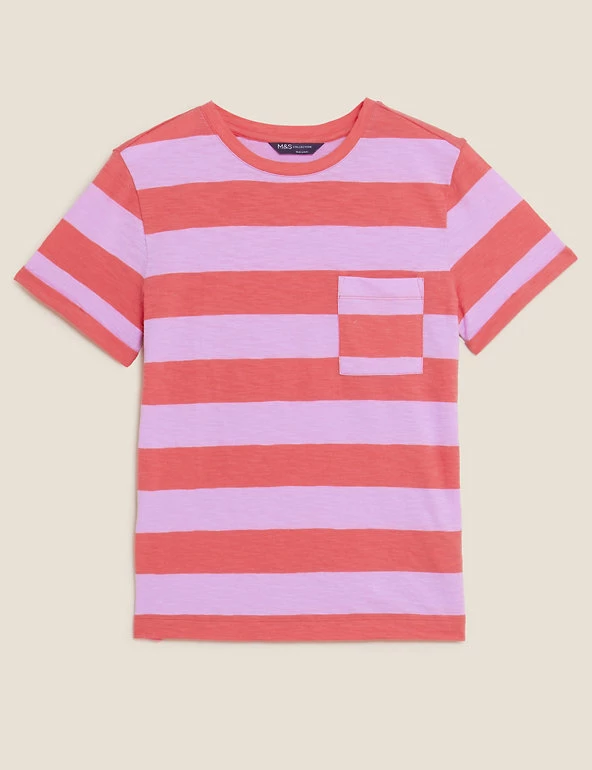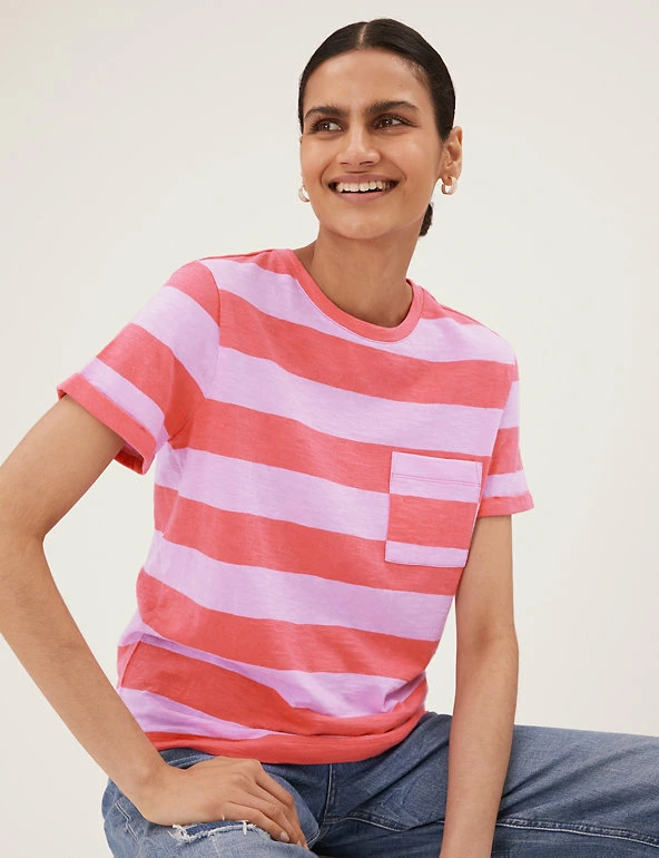 We’ve cut this crew neck t-shirt from pure cotton for breathability. It’s styled in a regular fit with bold contrasting-colour stripes. A patch pocket on the chest adds detail. We only ever use responsibly sourced cotton for our clothes.