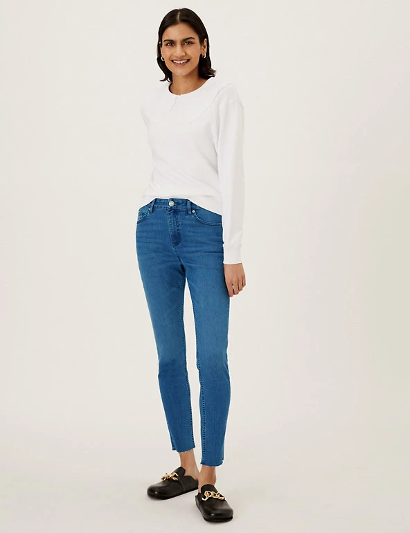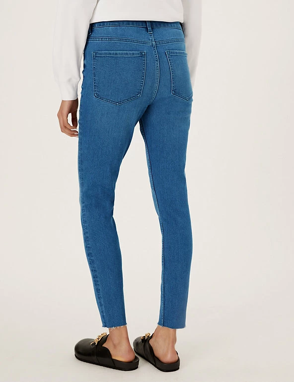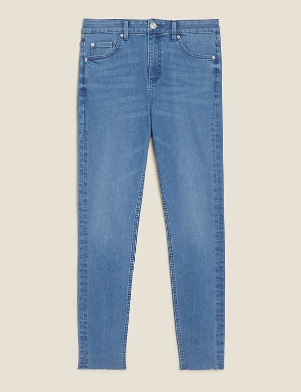 Discover your new laid-back look with these super-stretchy high-waisted jeans. Flattering skinny fit with a secure button and zip fastening. Raw ankle grazer hems for a contemporary look. All M&S denim is made with sustainably sourced cotton and less water. Dyeing with pre-reduced indigo reduces water and chemical use in production. Made with organic cotton.