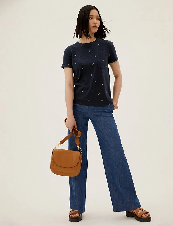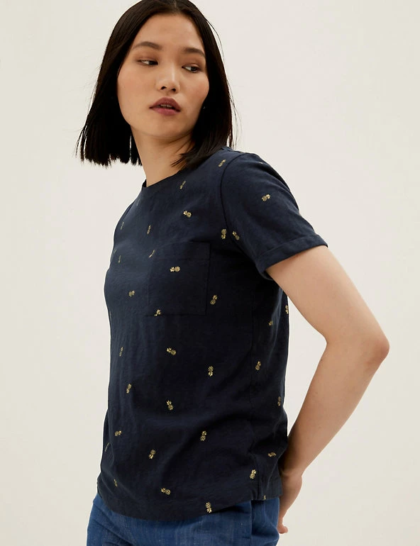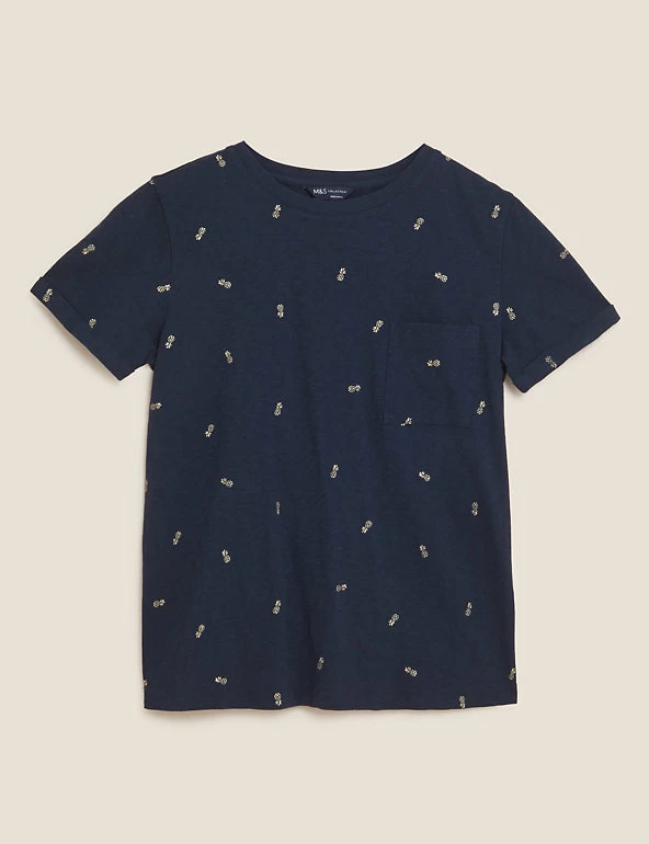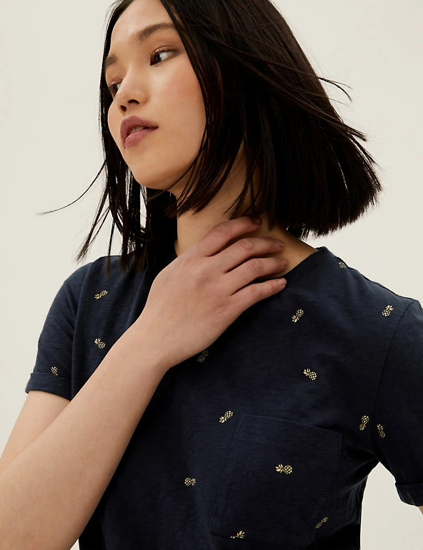 Decorated with foil pineapples, this pure cotton t-shirt packs a tropical punch. Regular fit. Soft slub fabric. Finished with a handy chest pocket. We only ever use responsibly sourced cotton for our clothes.