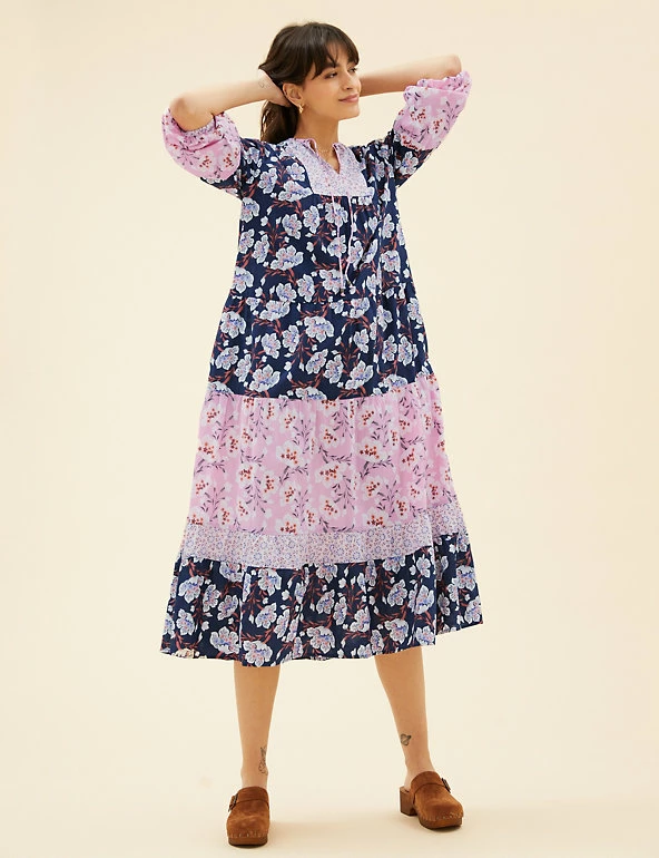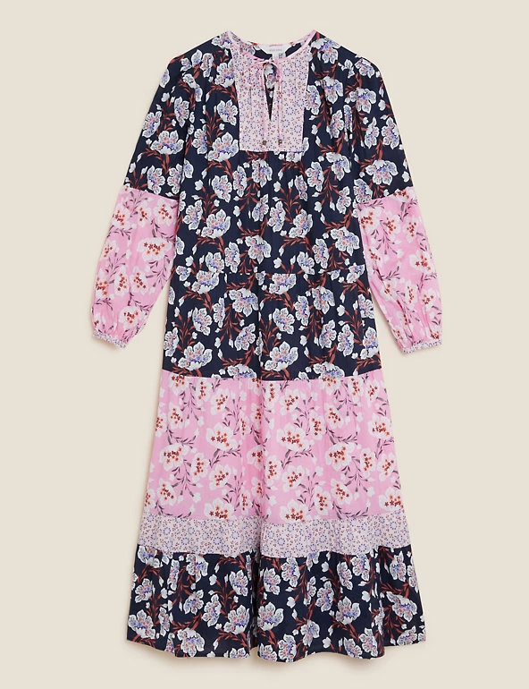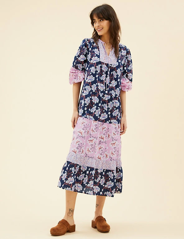 Turn heads with this pure cotton maxi smock dress from our Per Una range. It has a regular fit, with contrasting floral panels for a striking effect. Tiers through the skirt and blouson sleeves offer a touch of volume. Fasten it at the v-neck with the self-tie cord. We only ever use responsibly sourced cotton for our clothes.