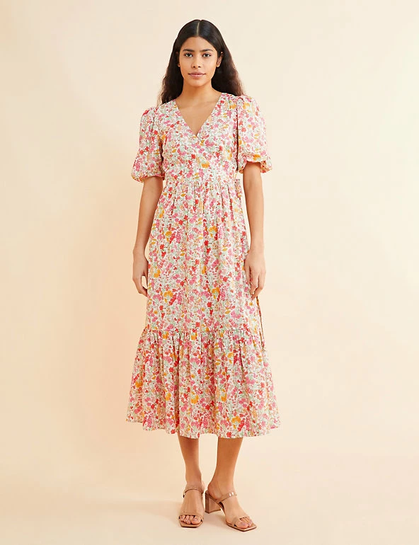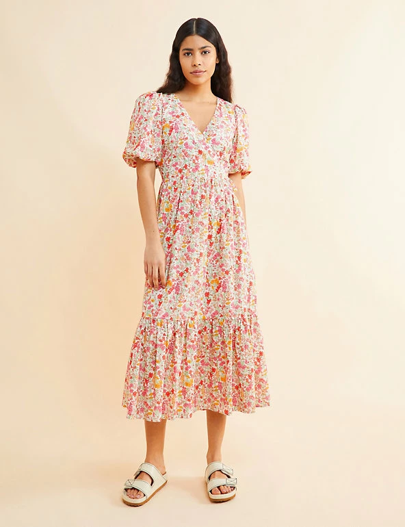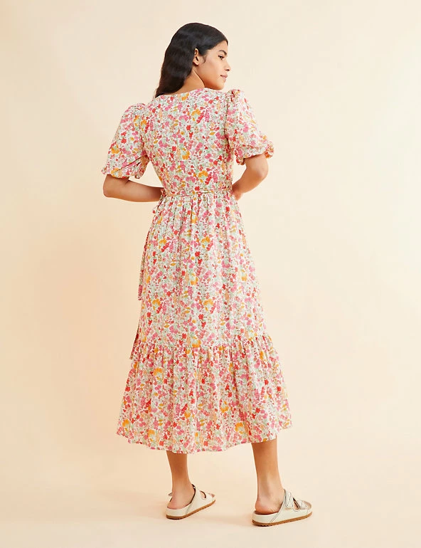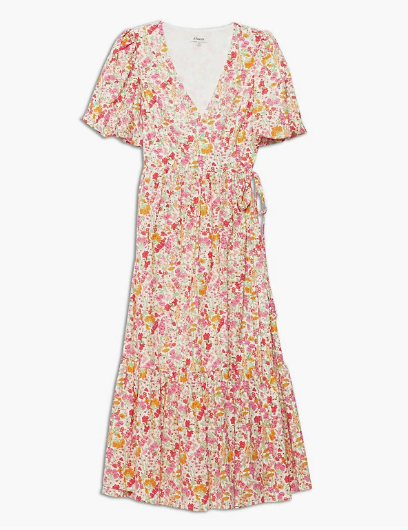 This feminine floral wrap dress from Albaray is perfect for long summer days. It’s cut to a regular fit, with a flattering v-neck and wrap bodice which fastens at the side. Short puff sleeves and a tiered midi skirt add a playful touch. Made with organic cotton.