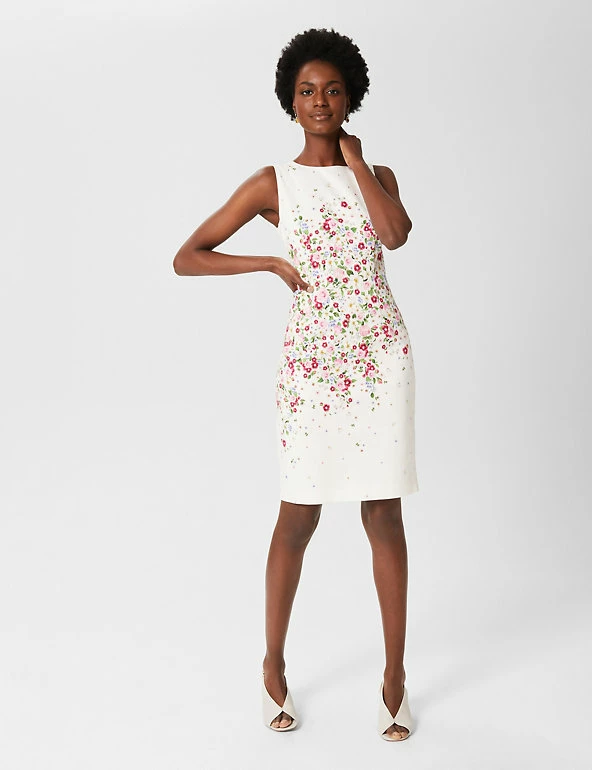 Be occasion-ready in this cotton-rich shift dress from Hobbs. This sleeveless style is cut to a flattering regular fit, with a round neck and a back slit for effortless all-day wear. Cascading florals give it a romantic feel that’s perfect for special events. It falls to the knee and is finished with a concealed zip fastening at the back.