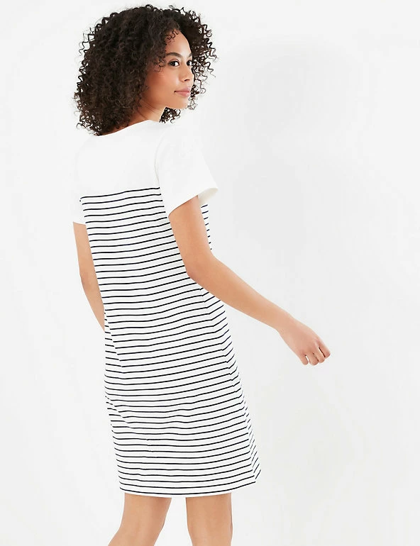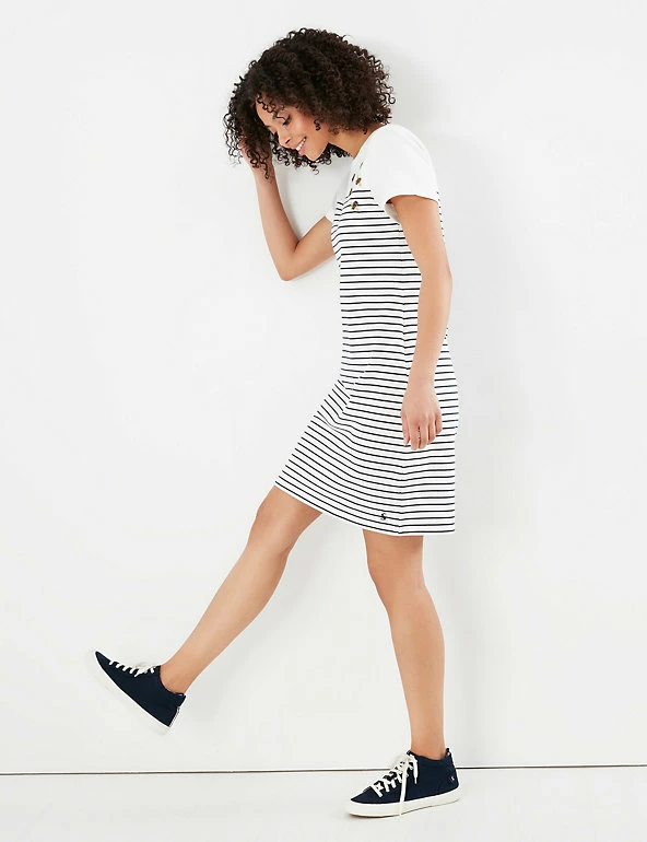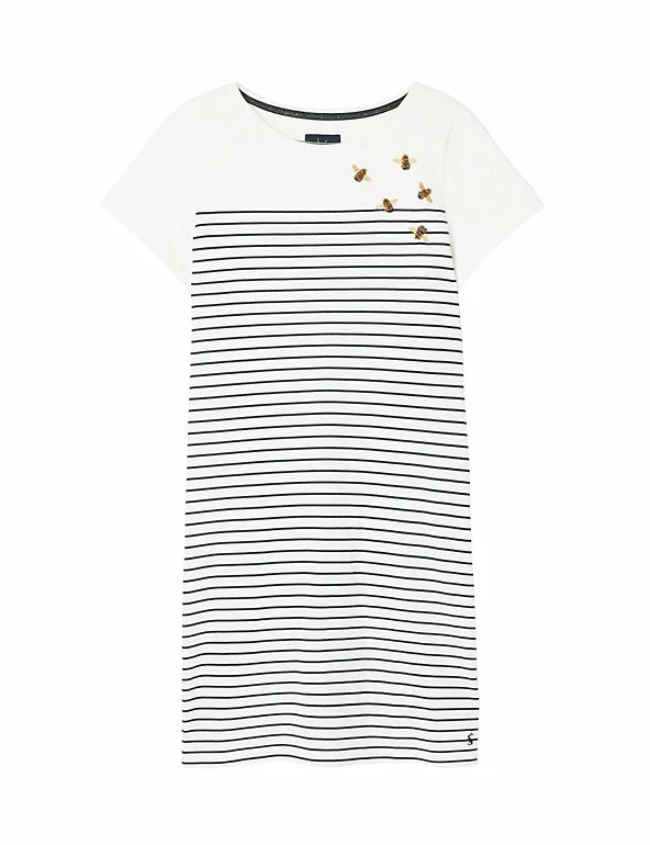 This pure cotton t-shirt dress from Joules is a lovely choice for chilled out afternoons and relaxed weekends. It’s cut in a comfy regular fit, with laid-back short sleeves and an easy round neck. Its crisp striped design is embellished with a sprinkling of embroidered bees at the neckline. The hemline finishes at a fun mini length.
