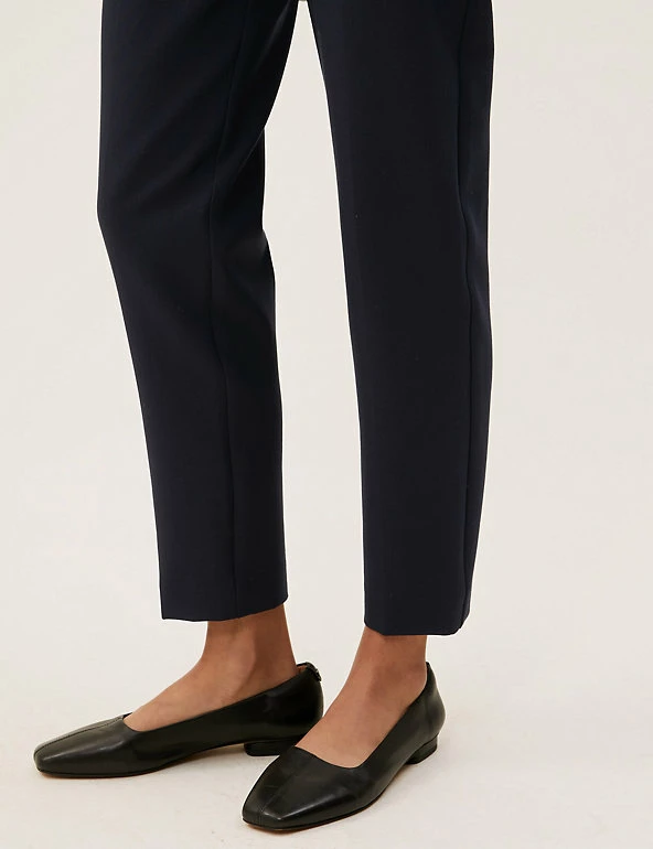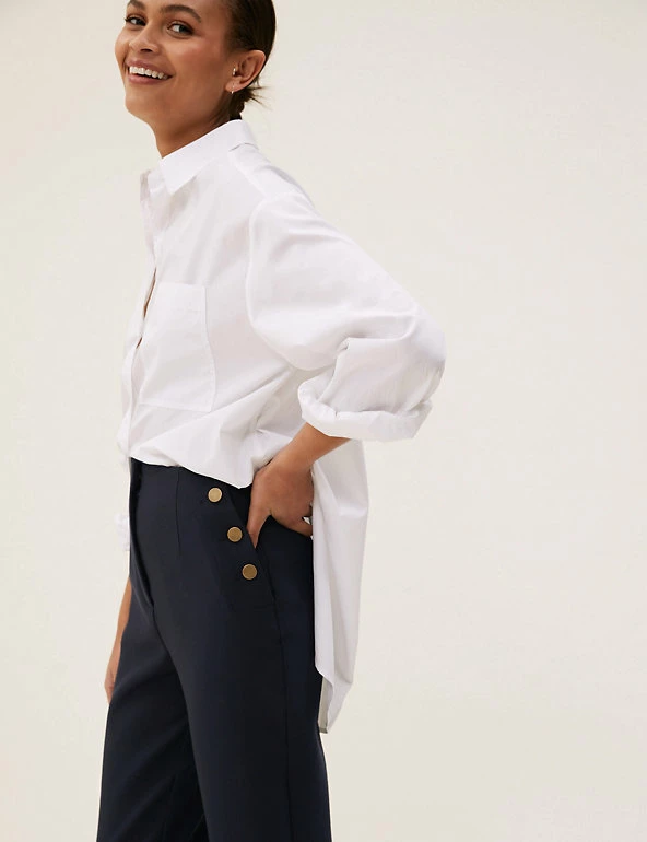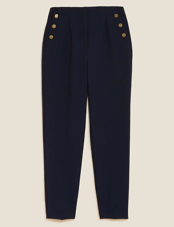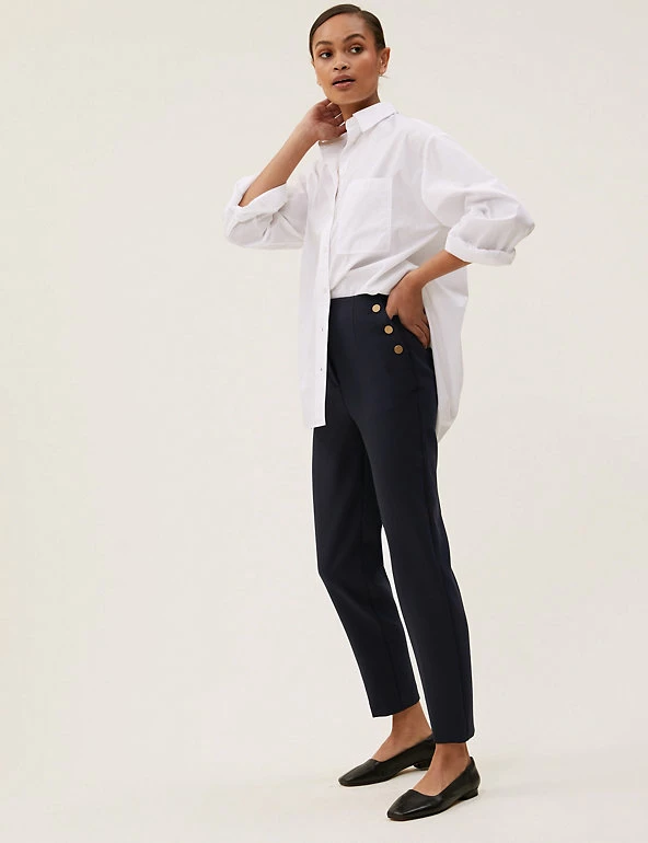 Antique gold buttons line the sides of these trousers for a dash of dazzle. Tapered fit, with darts and leg creases at the front and back for a tailored effect. Hook bar and zip fastening at the high waist for a secure fit and added stretch for comfort. Ankle-grazer length gives a contemporary finish. M&S Collection: easy-to-wear wardrobe staples that combine classic and contemporary styles.