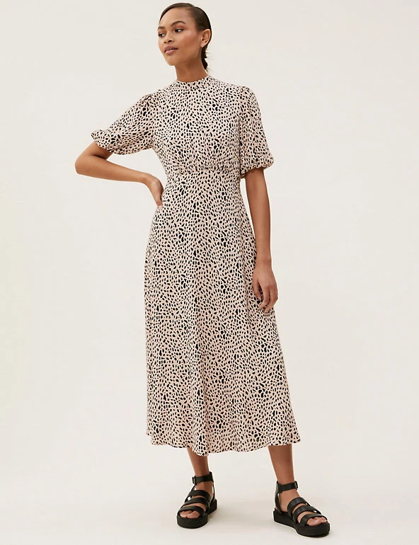 This versatile animal print tea dress has you covered for any occasion. It’s cut to an effortless regular fit, with a modern high neck and an easy midaxi length. Short puff sleeves and a waisted cut create a stylish silhouette. This piece is finished with a back zip fastening.