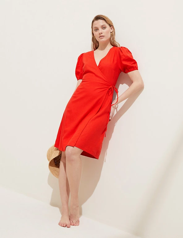 Bring a bright pop to a sunny day with this wrap dress, made from breathable linen-blend fabric. This mini style is cut in a regular fit with a flattering tie waist. The v-neck and short sleeves give an airy finish. Made with sustainably sourced viscose.