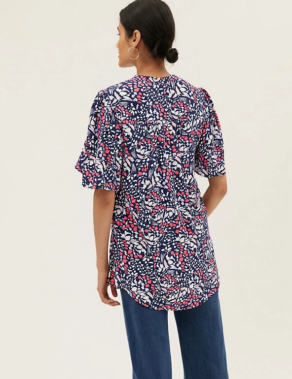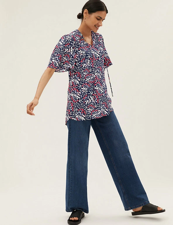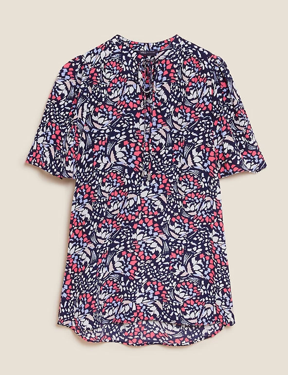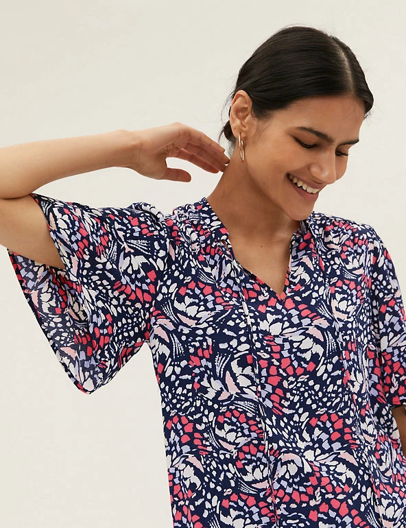 Pull on this popover blouse to add a fun touch to your everyday wardrobe. It’s cut in a regular fit, with a self-tie fastening at the v-neckline for an elegant feel. Short sleeves, a subtle high-low hem and a cheerful print offer the final flourish. M&S Collection: easy-to-wear wardrobe staples that combine classic and contemporary styles.