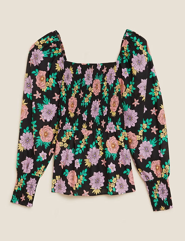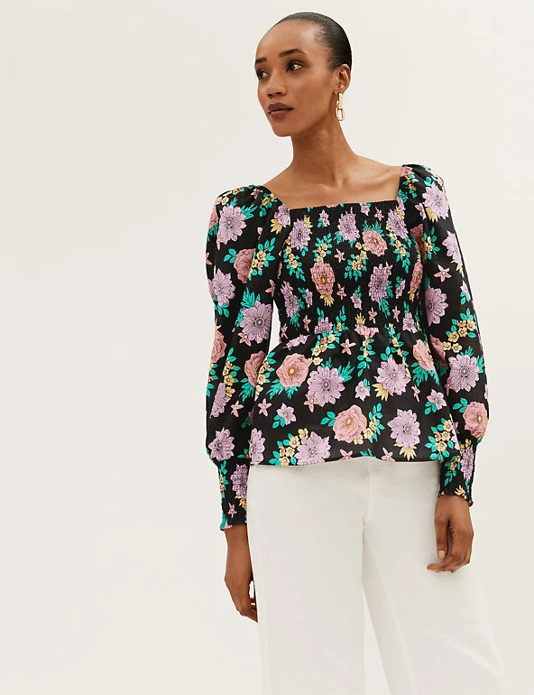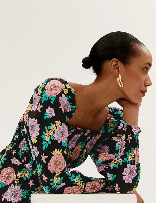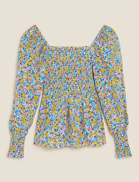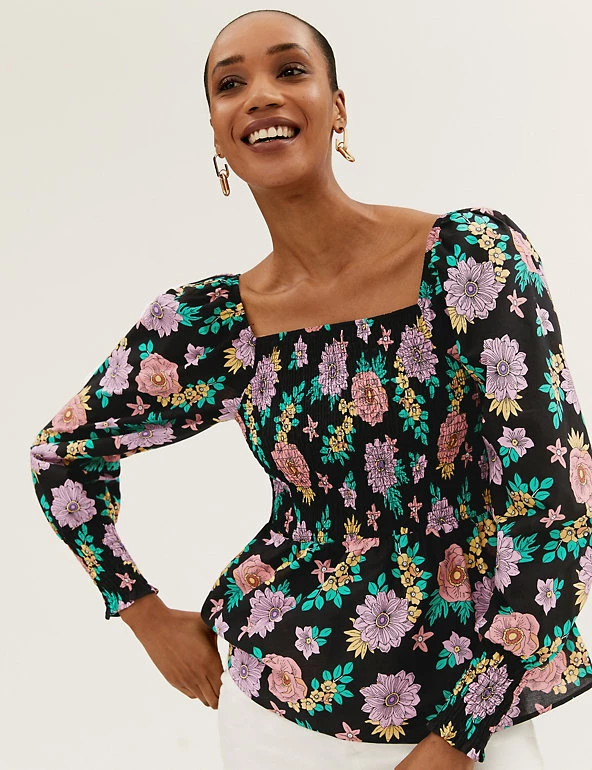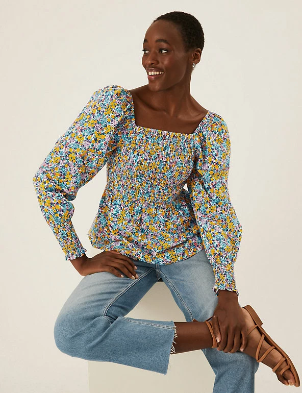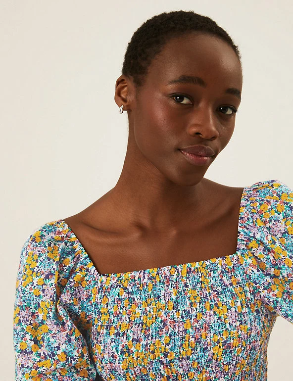 We’ve covered this pure cotton top with a dainty print for a feminine feel. Regular fit, with a shirred bodice and 3/4 puff sleeves for striking shaping. A contemporary square neck to finish. We only ever use responsibly sourced cotton for our clothes.