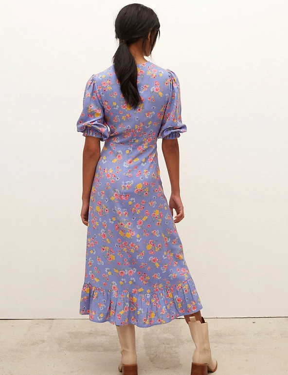 This romantic floral dress from Nobody’s Child was made to flatter with its sleek empire line silhouette. Crafted in a regular fit, this midi dress has a classic round neck and three-quarter sleeves with elasticated cuffs for pretty volume. The flowing skirt features a frilled hem for a nostalgic look. This piece fastens with a discreet zip at the back. Made with sustainably sourced viscose.
