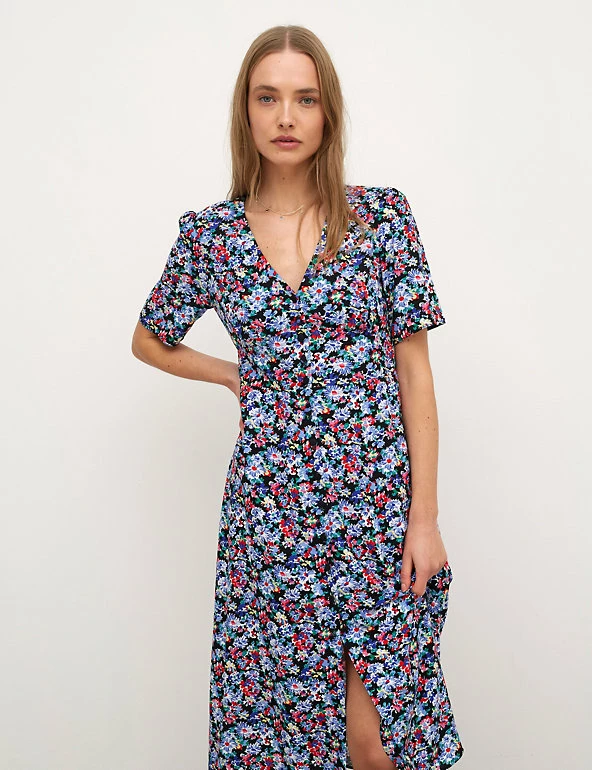 Painterly flowers bloom all over this feminine tea dress from Nobody’s Child. It’s designed in a regular fit, with a flattering v-neckline and breezy short sleeves. Sitting pretty at midaxi length, with waisted panel detailing, this number was made to complement your figure. It’s finished with a button-through fastening. Made with sustainably sourced viscose. Nobodyโs Child designs are cut to a form-fitting shape, so if you’re looking for a more relaxed fit, we recommend choosing the next size up.