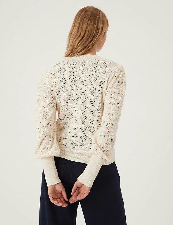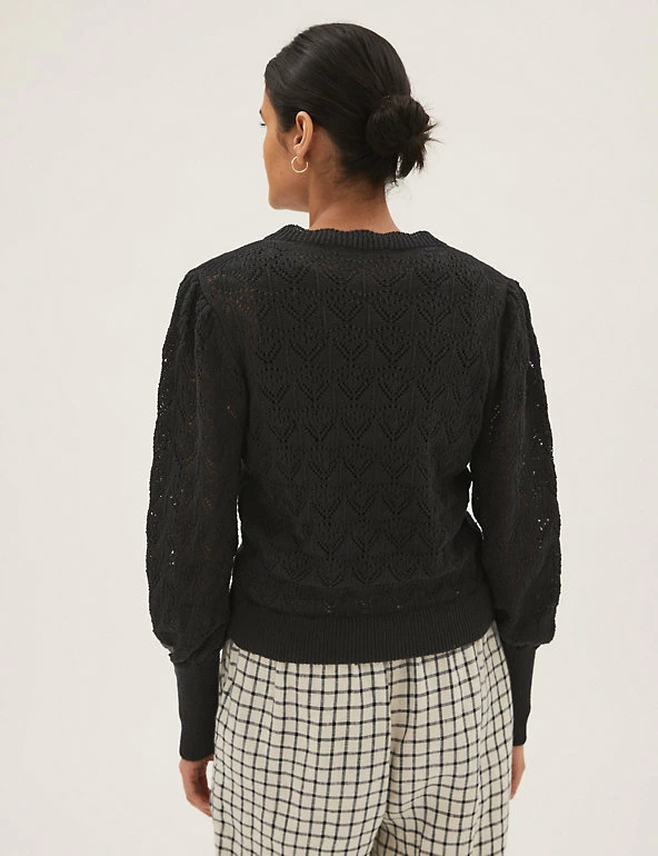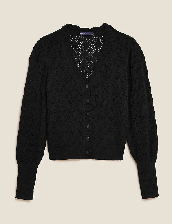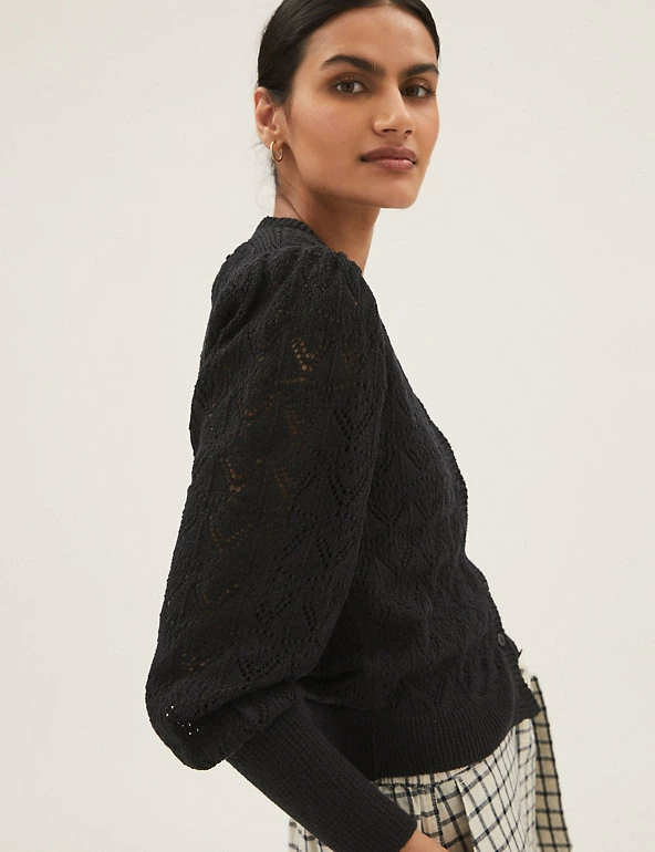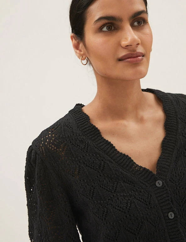 Add a textural twist to your knitwear wardrobe with this cotton-rich pointelle cardigan. It’s cut to a regular fit, with a flattering v-neckline and long sleeves. This piece has ribbed trims for a snug feel and a button-through closure. All of the cotton for our clothing is sustainably sourced and always will be. M&S Collection: easy-to-wear wardrobe staples that combine classic and contemporary styles.