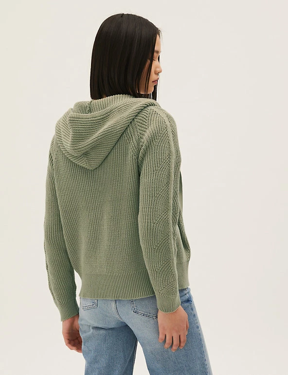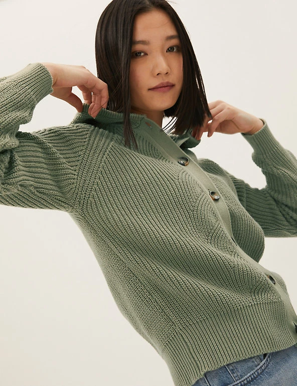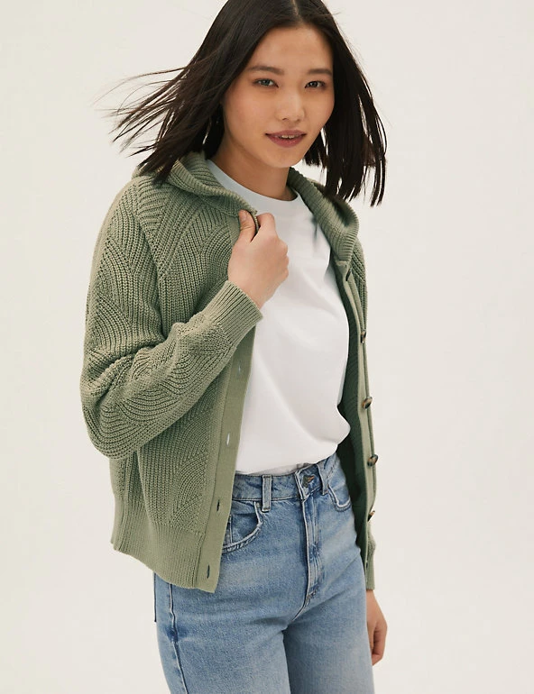 Add a cosy casual layer to your wardrobe with this cotton-ricn cardigan. It’s made to an easy relaxed fit with a classic button-down fastening and a handy hood. The patterned knit creates a stylish textured finish. We only ever use responsibly sourced cotton for our clothes.